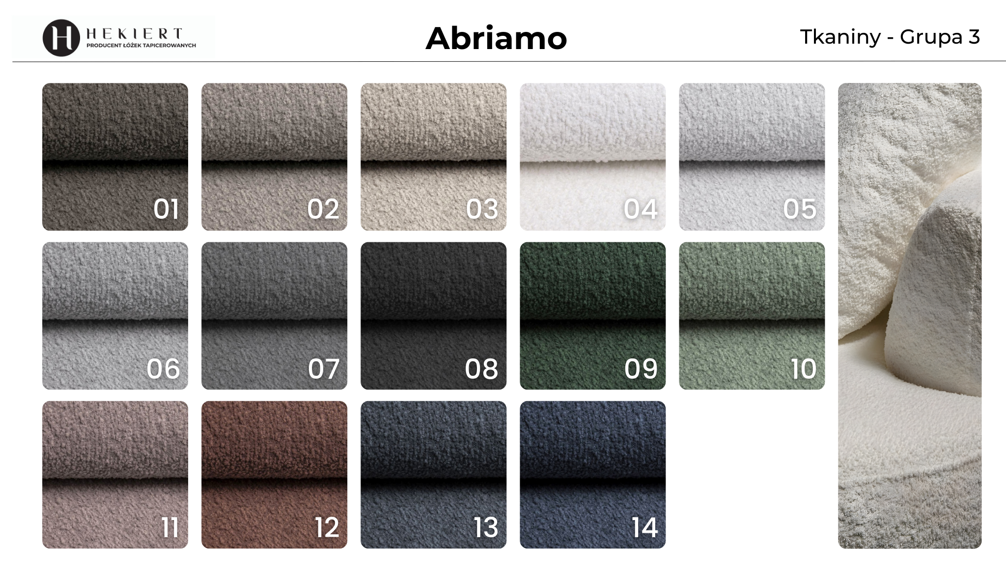 Abriamo - to nowoczesna, gruba tkanina tapicerska typu boucle (bukla) o charakterystycznej, pętelkowej strukturze, przypominającej plusz lub gęstą dzianinę. Jest trwała (45 000 cykli Martindale'a), trudnopalna i często produkowana z poliestru (w tym rPET z recyklingu). Idealna na meble wypoczynkowe, nadaje wnętrzom przytulny, trójwymiarowy efekt.