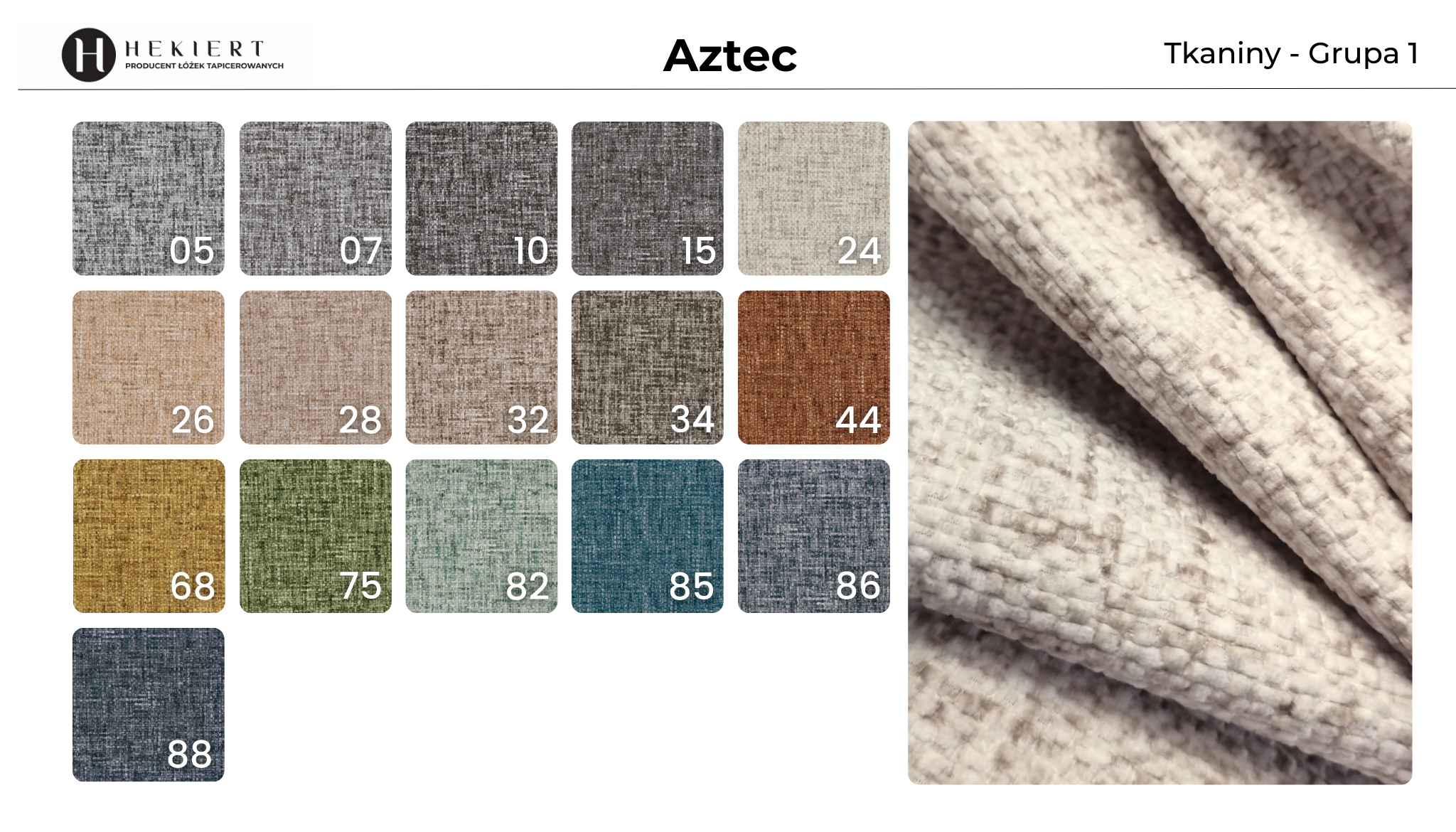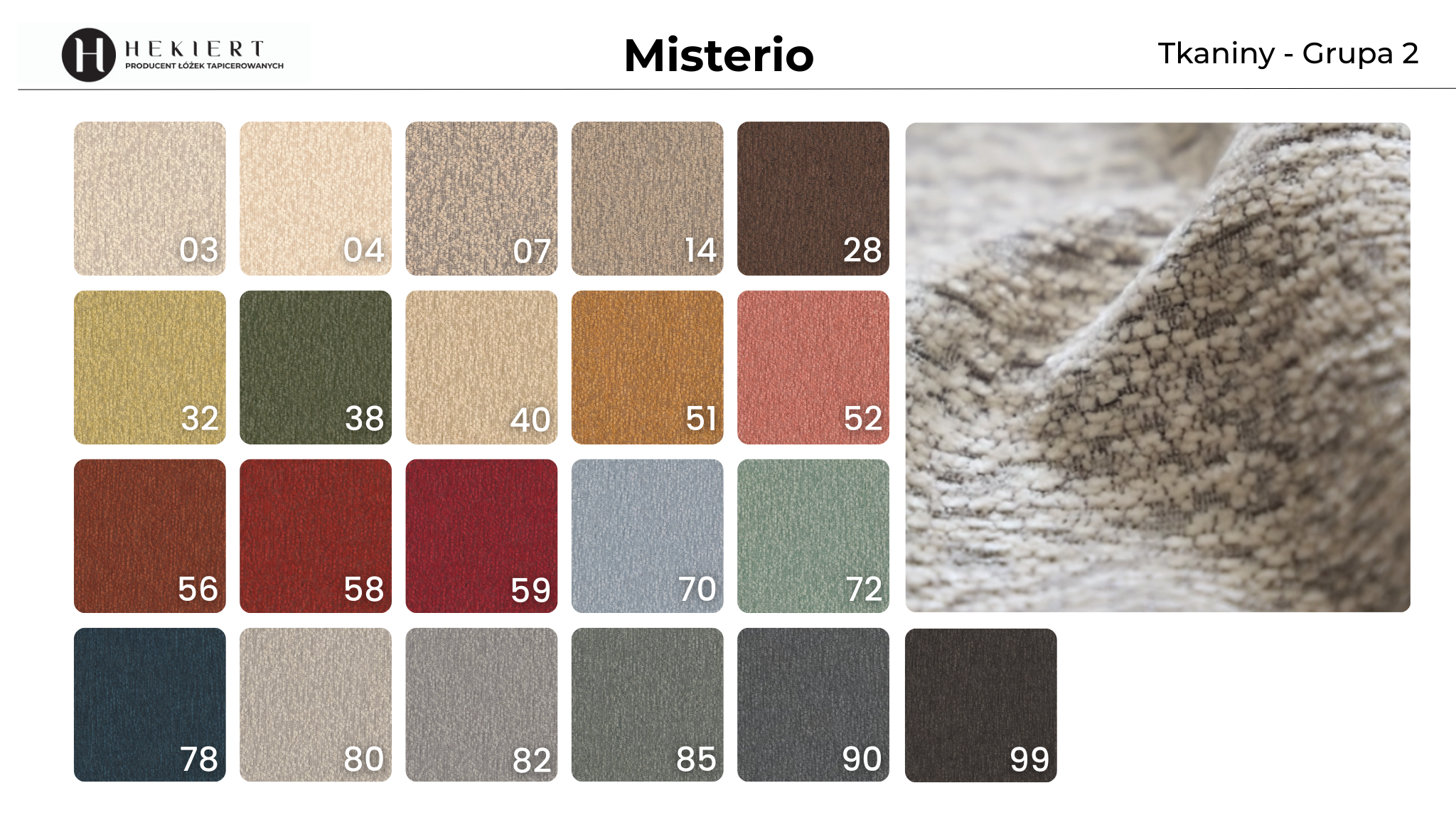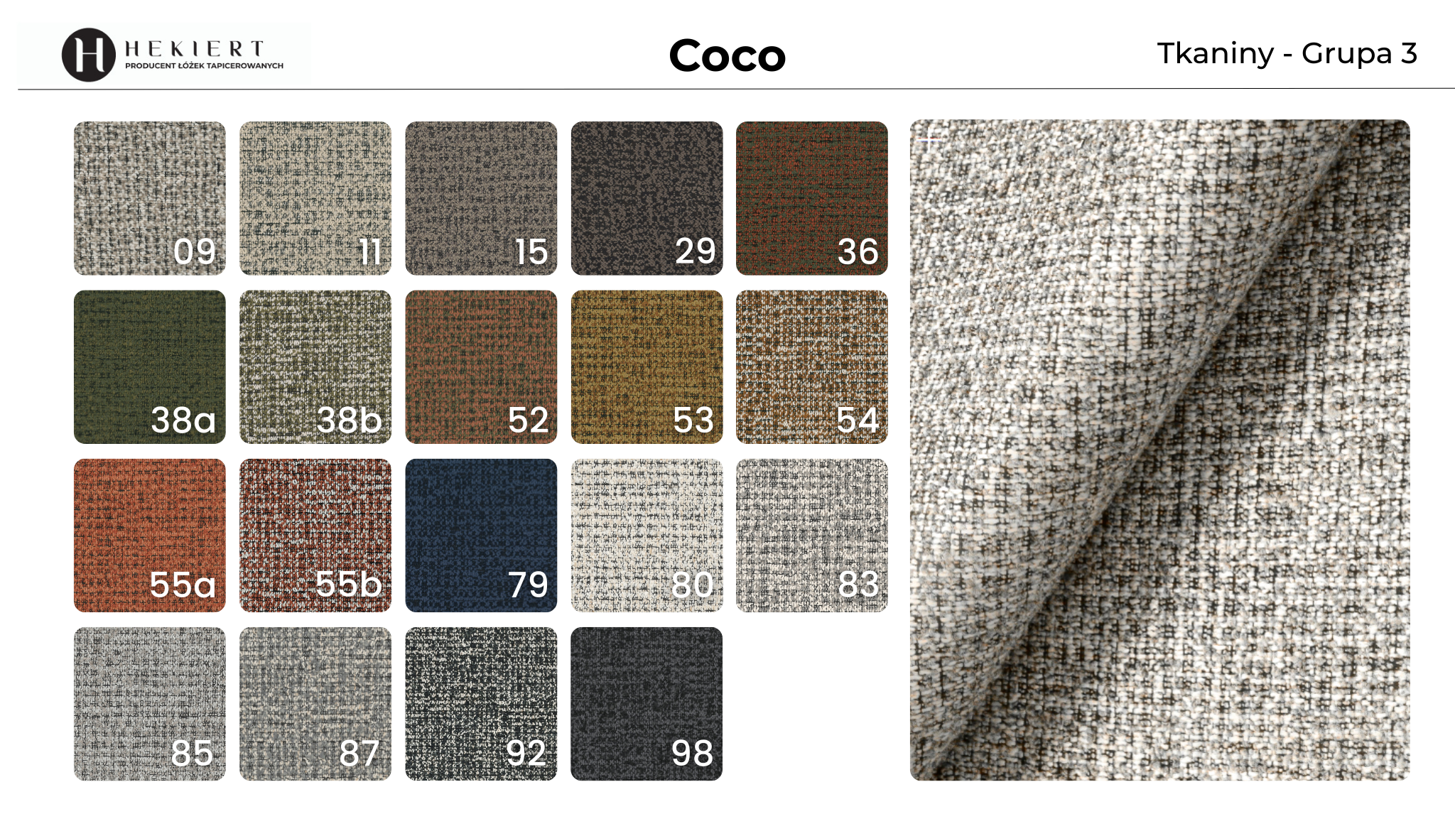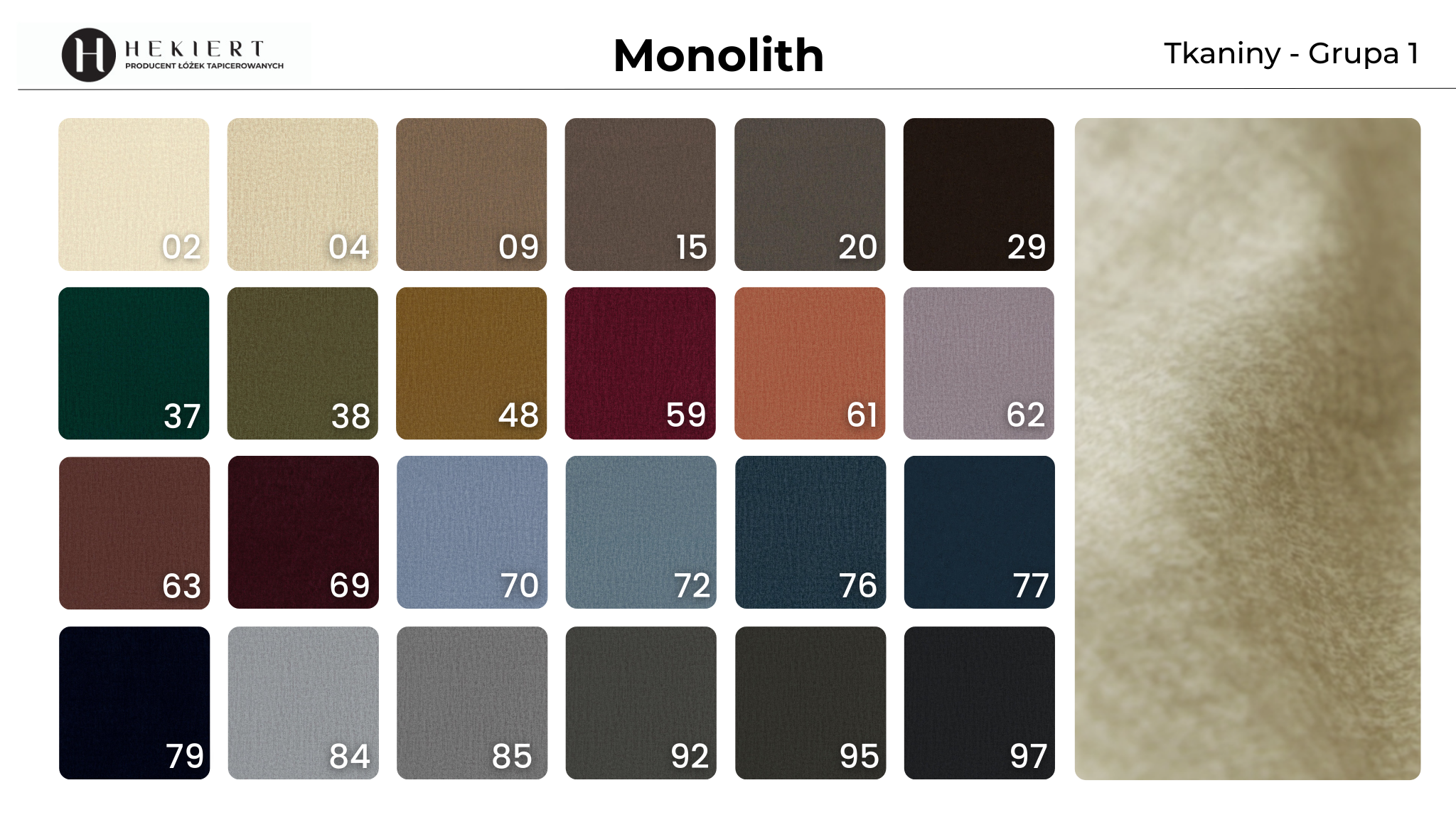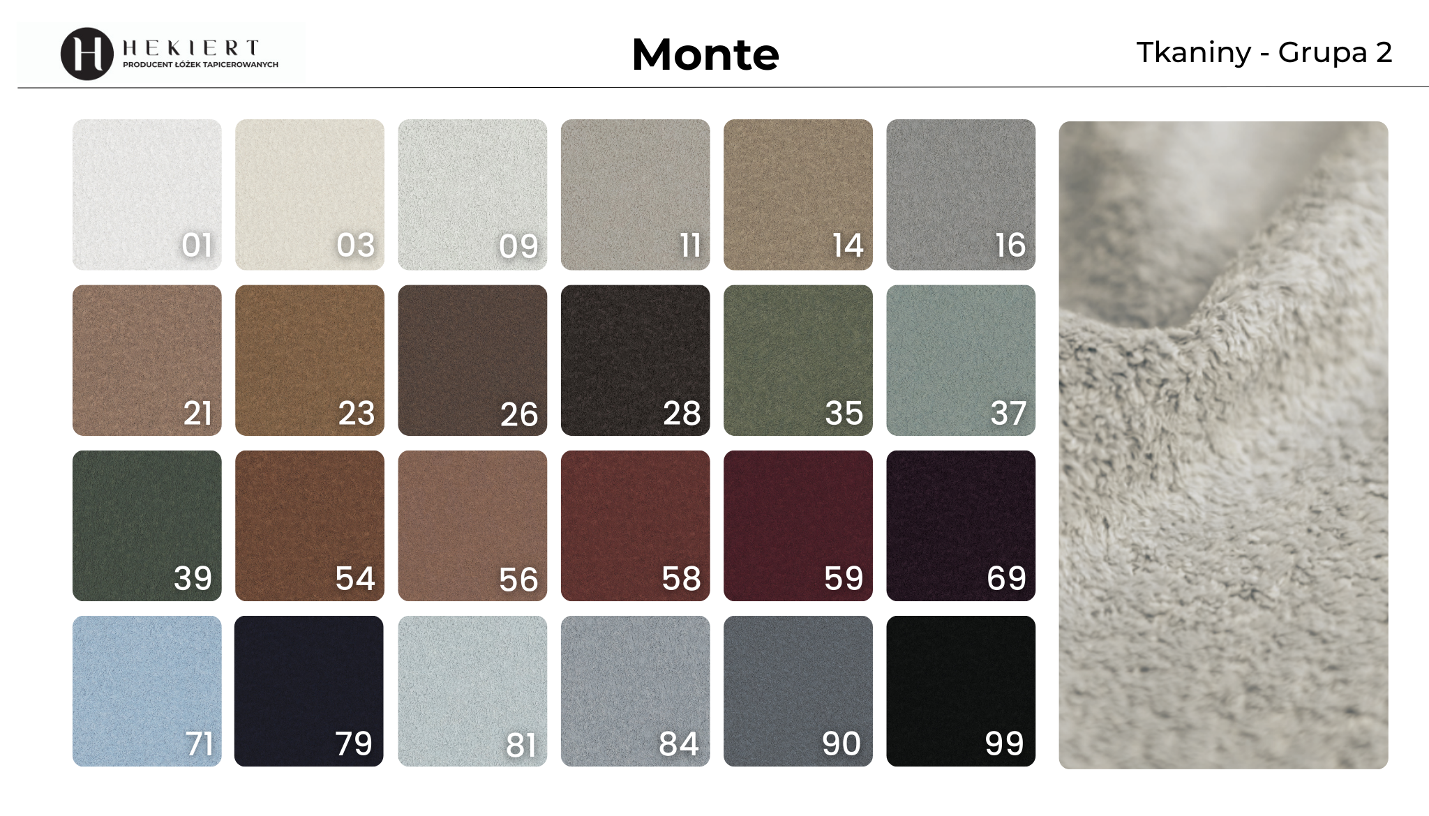 Monte - to trwała, strukturalna dzianina tapicerska o grubym splocie i nieregularnym, krótkim włosie, często przypominająca styl boucle. Charakteryzuje się wysoką gramaturą ( 380 g/m² ) oraz bardzo wysoką odpornością na ścieranie ( 90000 cykli Martindale'a). Idealna do nowoczesnych wnętrz typu cozy, oferując miękkość i trudnopalność.