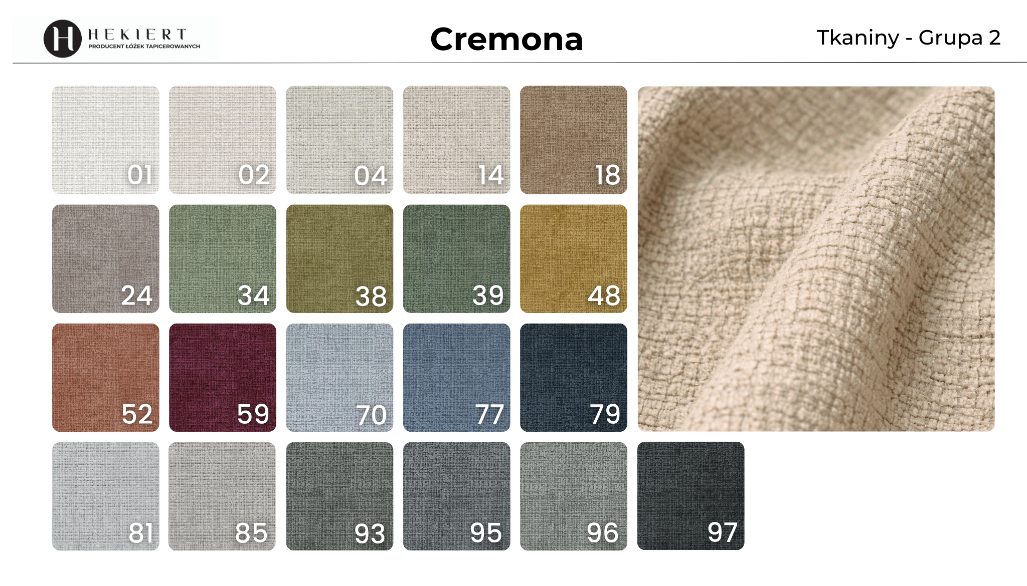 Cremona - to nowoczesna, gruba plecionka szenilowa o wyczuwalnej, trójwymiarowej strukturze (przypominającej boucle) i aksamitnym, miękkim dotyku. Jest to wytrzymały materiał obiciowy (100% poliester, gramatura 465 g/m²:), charakteryzujący się wysoką odpornością na ścieranie (60 000–70 000 cykli Martindale'a) oraz spełniający normy REACH.