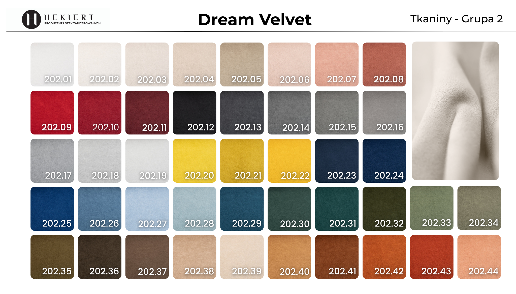 Dream Velvet - to tkanina tapicerska wyjątkowo miękka o jednolitej matowej powierzchni, bardzo plastyczna. Dzięki zastosowaniu technologii Cleanaboo rozlane płyny nie przenikają tapicerki oraz łatwo je usunąć. Atutem tkaniny jest technologia Petproof wykazuje odporność na zwierzaki. Tkanina obiciowa jest w bogatej gamie kolorystycznej które są mocne i wyraziste. Tkanina idealnie sprawdza się na meblach tapicerowanych, sofach, fotelach, tapczanach, pufach jak i na poduszkach.