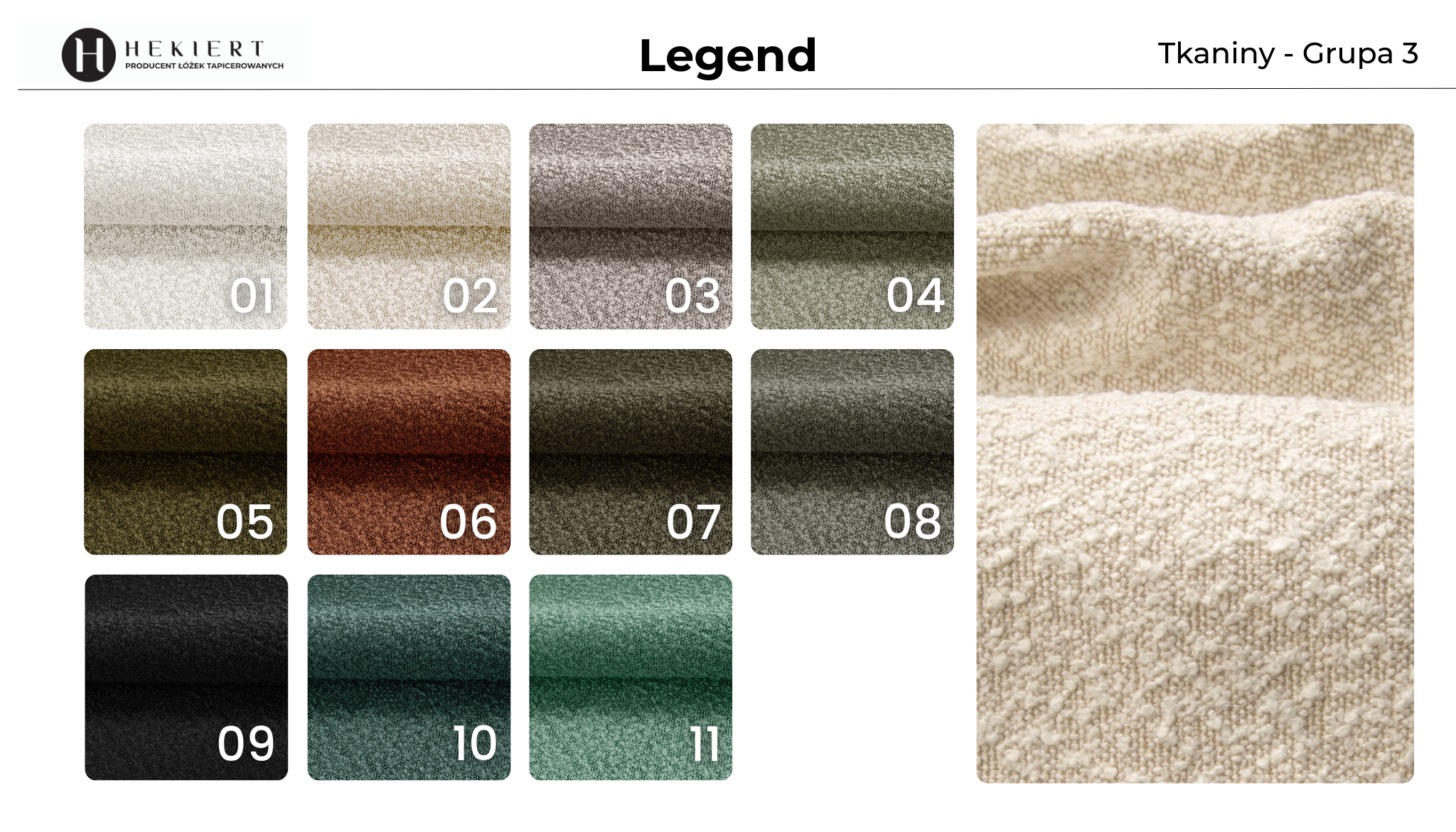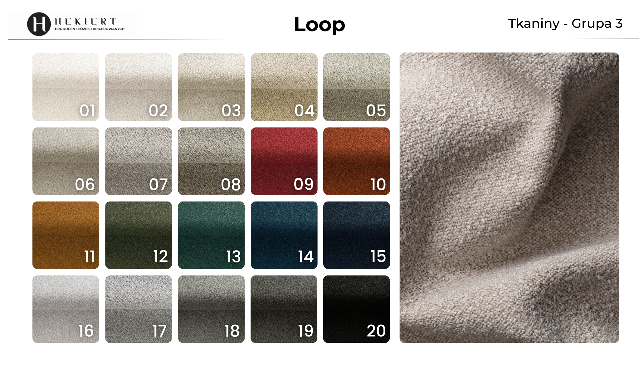 Loop - to wysokiej jakości materiał obiciowy typu boucle (bukla), charakteryzujący się pętelkową, kędzierzawą strukturą przypominającą "baranka". Jest to gruba, trwała (100 000 cykli Martindale'a) i miękka tkanina, idealna do nowoczesnych mebli o zaokrąglonych kształtach, oferująca przytulny wygląd, wysoka gramaturę (540 g/m²) oraz odporność na ścieranie.