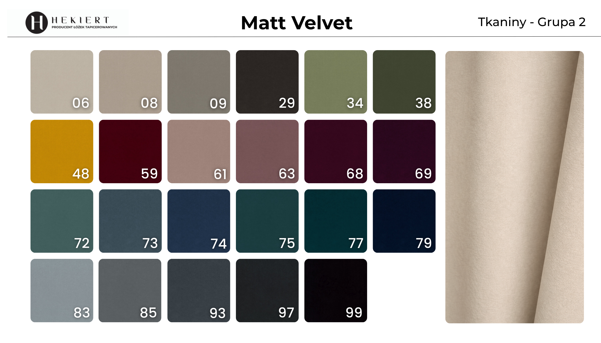 Matt Velvet - to wyjątkowa tkanina obiciowa, która łączy w sobie elegancję, wygodę i praktyczność. Ten mięsisty, miękki welur o matowej powierzchni sprawia, że każde wnętrze nabiera stylu i klasy. Nie tylko prezentuje się pięknie, ale jest także bardzo funkcjonalny – dzięki swoim właściwościom plamoodpornym i wodoodpornym idealnie sprawdzi się w codziennym użytkowaniu, zarówno w domu, jak i w przestrzeniach publicznych.