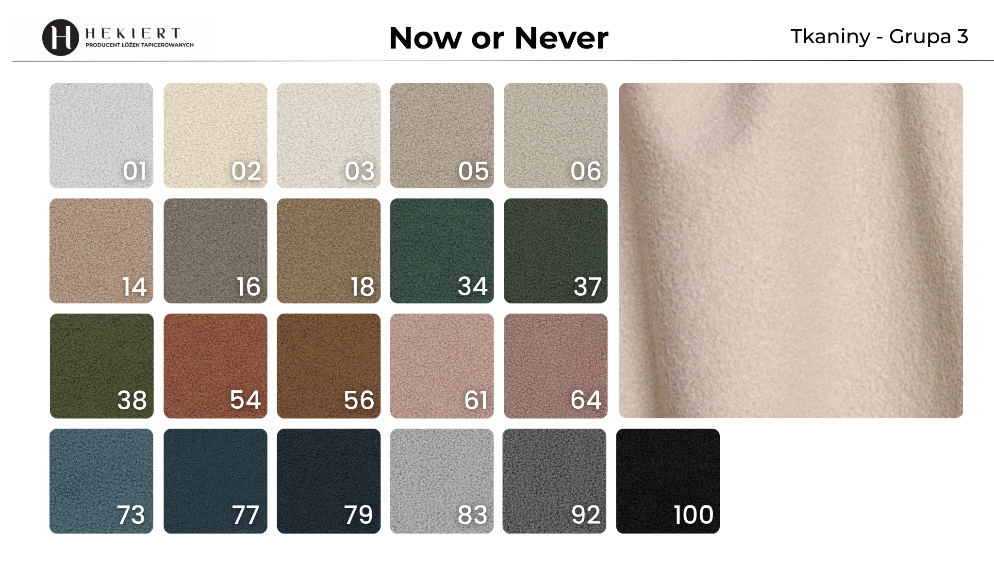 Now or Never - to wytrzymała, mięsista i puszysta tkanina obiciowa typu boucle (bukla) marki Davis Fabrics, produkowana w 100% z poliestru z recyklingu. Charakteryzuje się trójwymiarową strukturą z pętelkami i węzełkami, przypominającą miękki szenilowy sweter. Posiada wysoką odporność na ścieranie (90 000–100 000 cykli Martindale’a) oraz wysoką gramaturę 420 g/m².