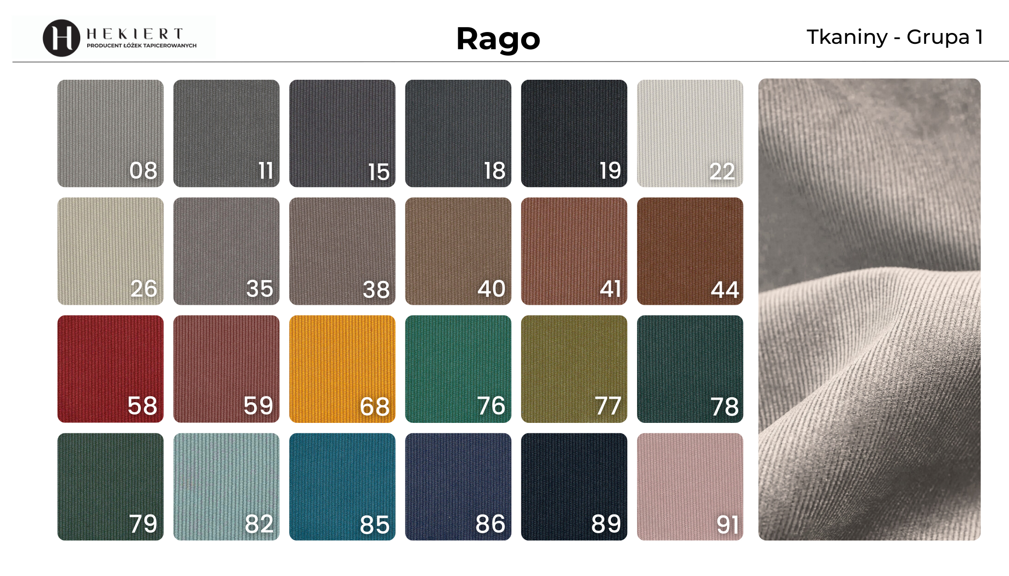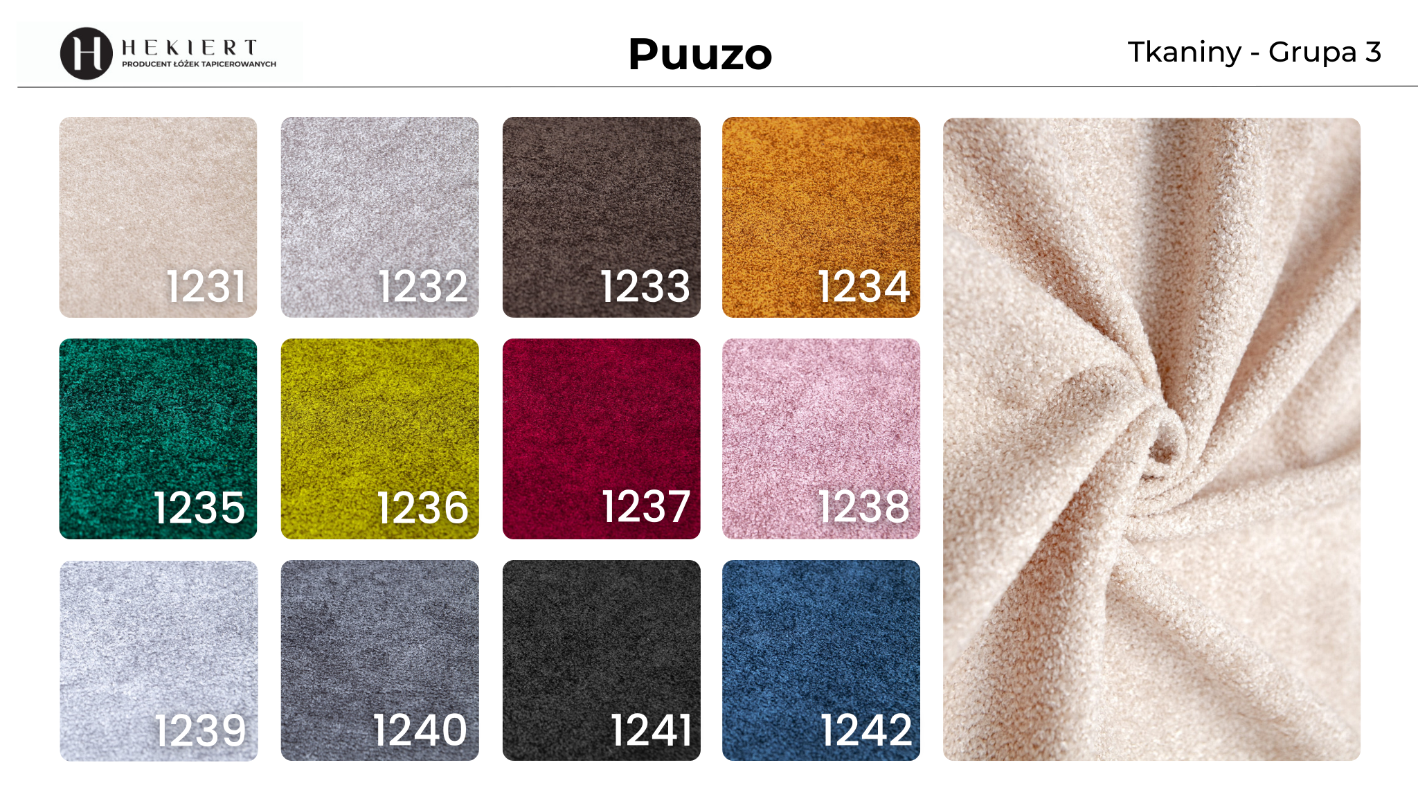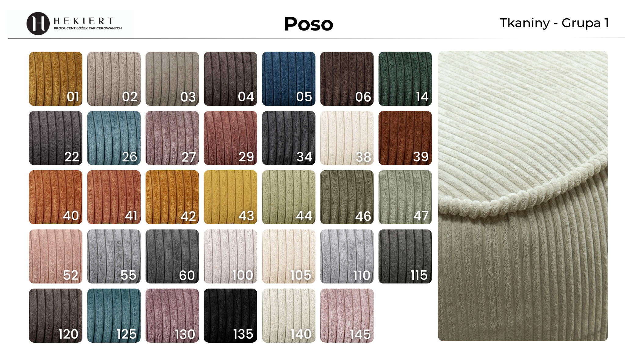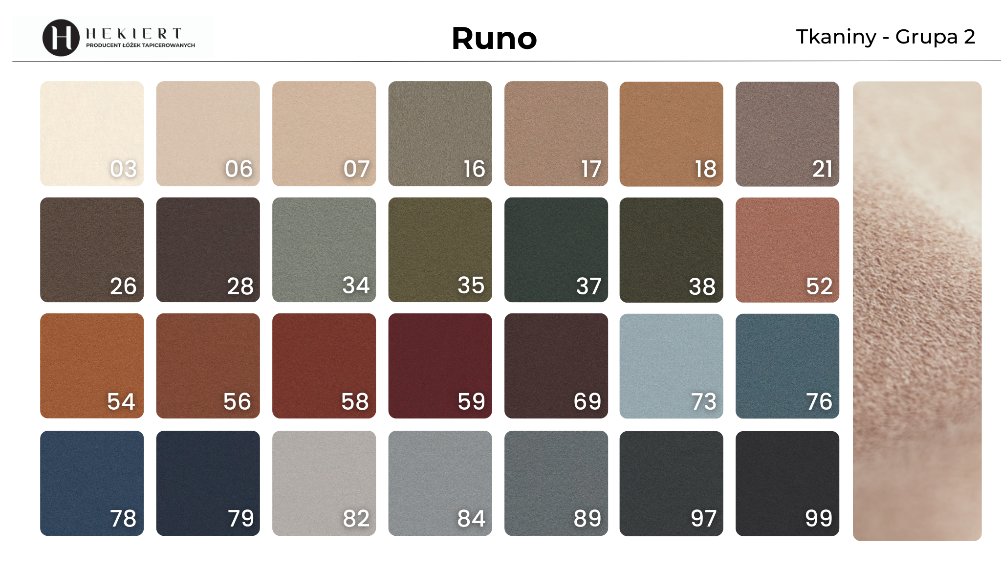 Runo - to elegancki, welurowy materiał obiciowy o charakterystycznym, krótko przystrzyżonym włosiu, zapewniającym subtelny połysk i wyjątkową miękkość. Wykonana w 100% z poliestru, charakteryzuje się wysoką trwałością (50 000–60 000 cykli Martindale'a), odpornością na mechacenie i jest przytulna, często stosowana w stylu "calm & cosy".