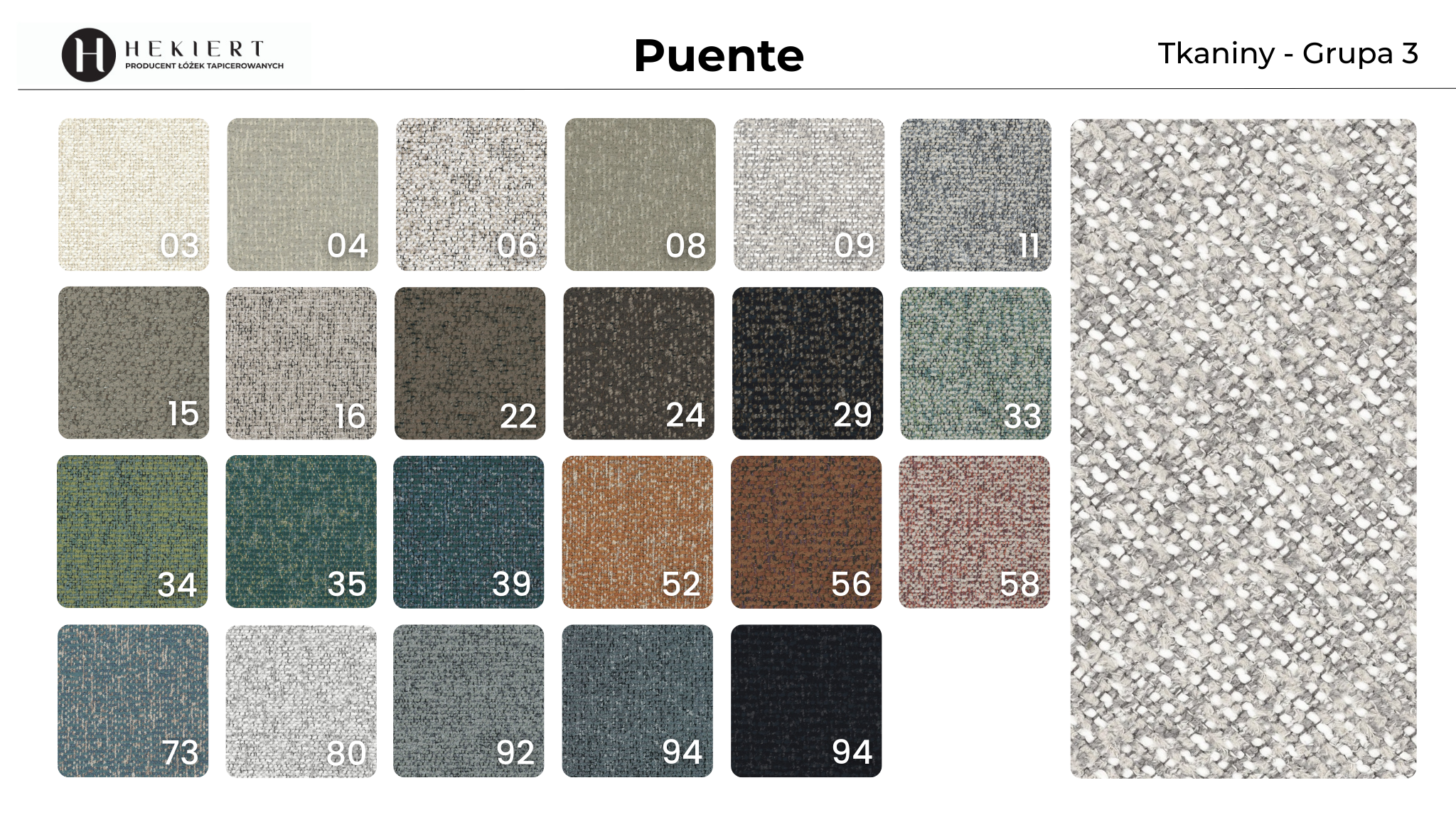 Puente - to nowoczesny, gruby szenil o wyczuwalnej, strukturalnej plecionce i melanżowym efekcie kolorystycznym. Charakteryzuje się miękkością i ciepłem w dotyku dzięki dodatkowi bawełny. Jest trwała, o podwyższonej gramaturze, idealna na meble tapicerowane w nowoczesnym stylu.