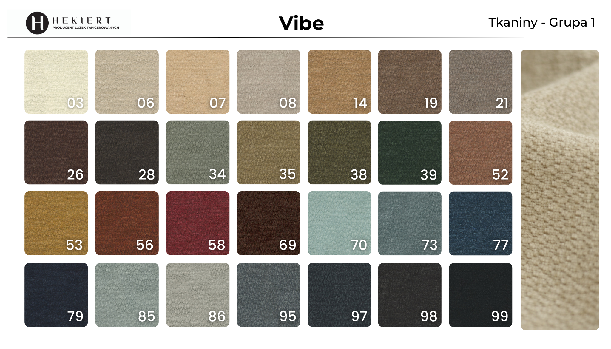 Vibe - to nowoczesna, wytrzymała tkanina szenilowa o delikatnej, melanżowej strukturze i przyjemnym w dotyku, miękkim wykończeniu. Charakteryzuje się wysoką odpornością na ścieranie (30 000-35 000 cykli Martindale'a), pillingu oraz trudnopalnością. Jest idealna na meble tapicerowane, zapewniając stylowy, matowy wygląd i łatwość w codziennej pielęgnacji.