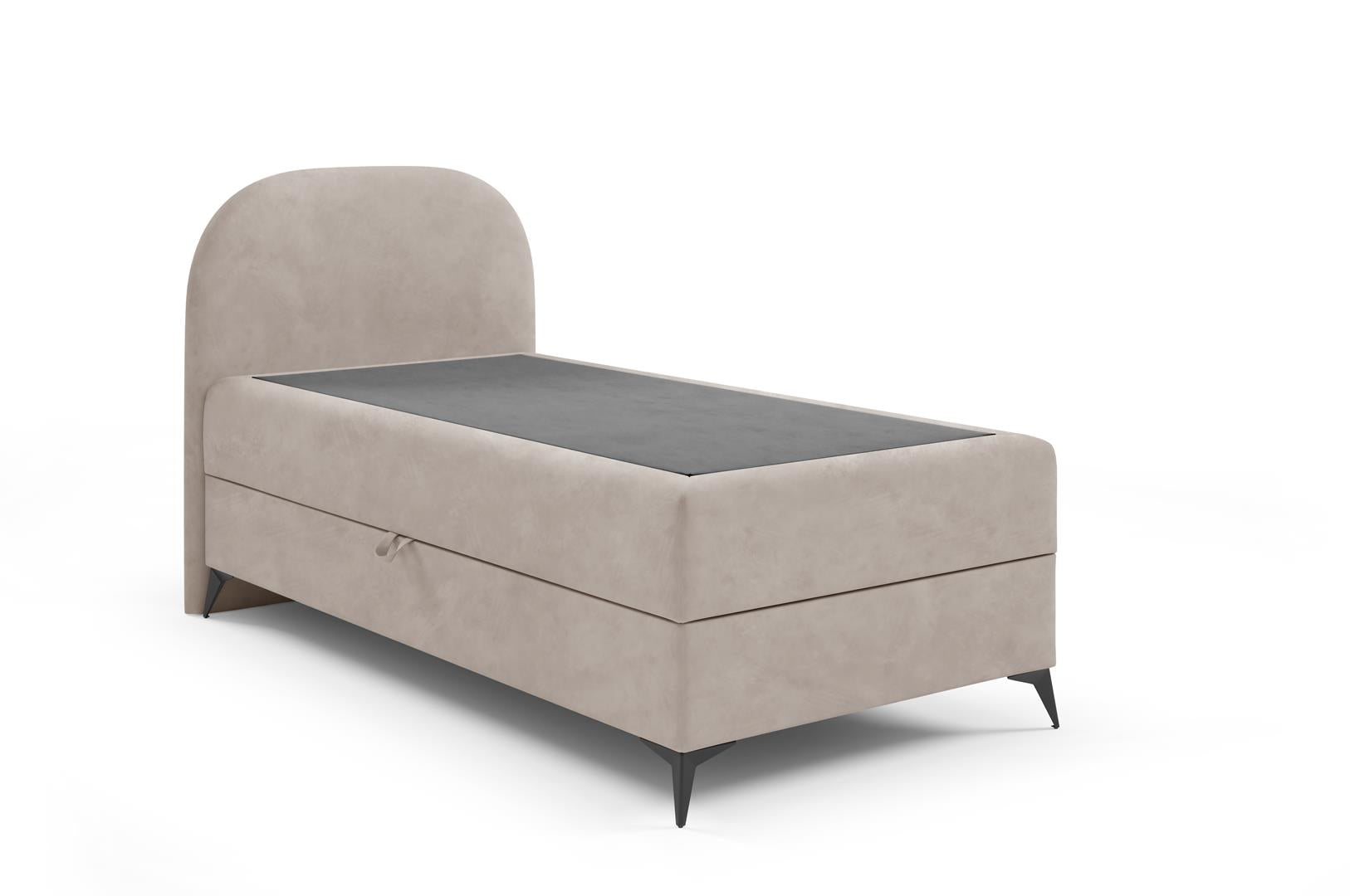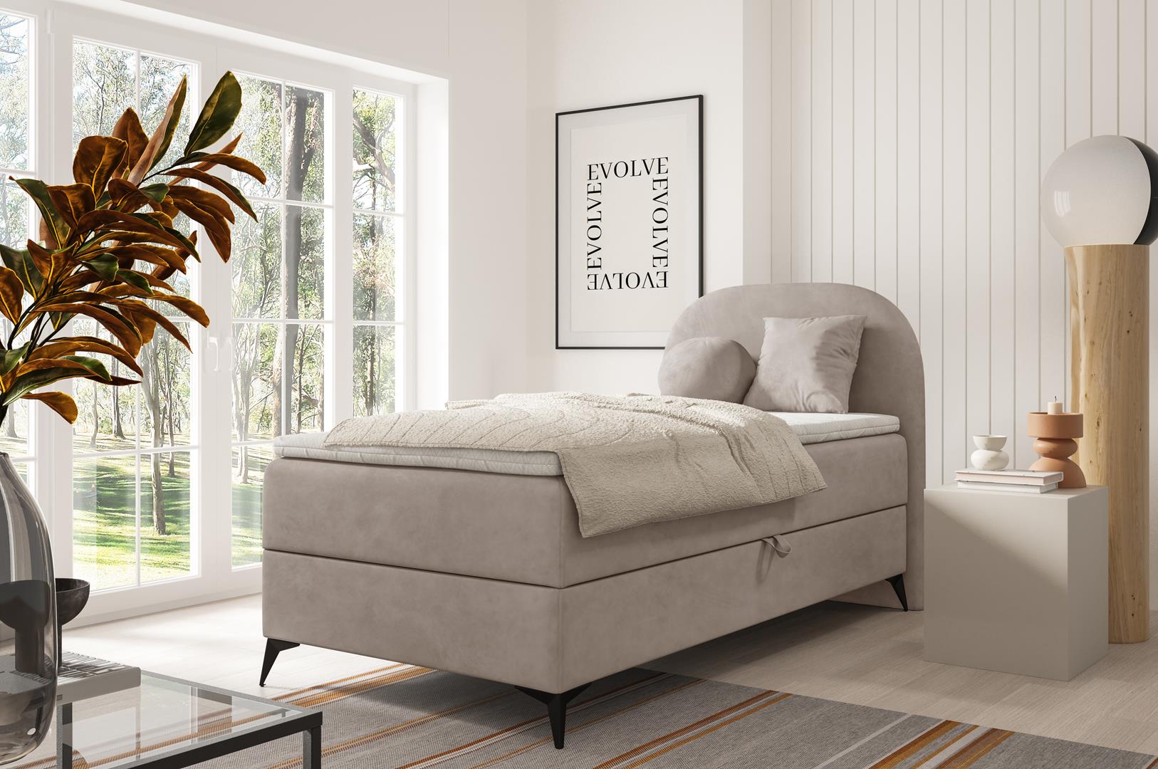 Nowoczesne łóżko o lekkiej formie, osadzone na stylowych, wysokich nóżkach, które dodają mu elegancji i zapewniają praktyczny dostęp do podłoża – z łatwością wjedziesz tam odkurzaczem automatycznym lub tradycyjnym.