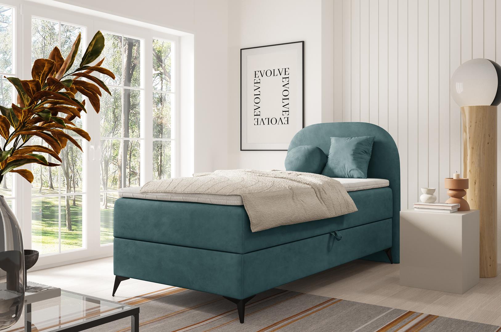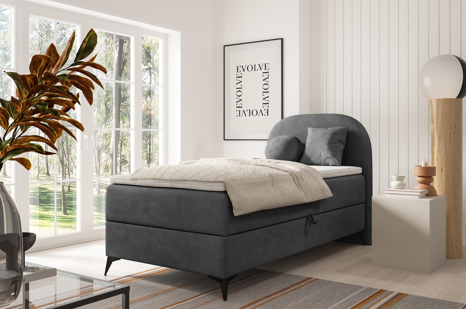 Funkcjonalne łóżko z dużym pojemnikiem na pościel, otwieranym na automacie sprężynowy. Przemyślana konstrukcja zapewnia dużo miejsca do przechowywania, a łóżko świetnie prezentuje się w nowoczesnym wnętrzu.