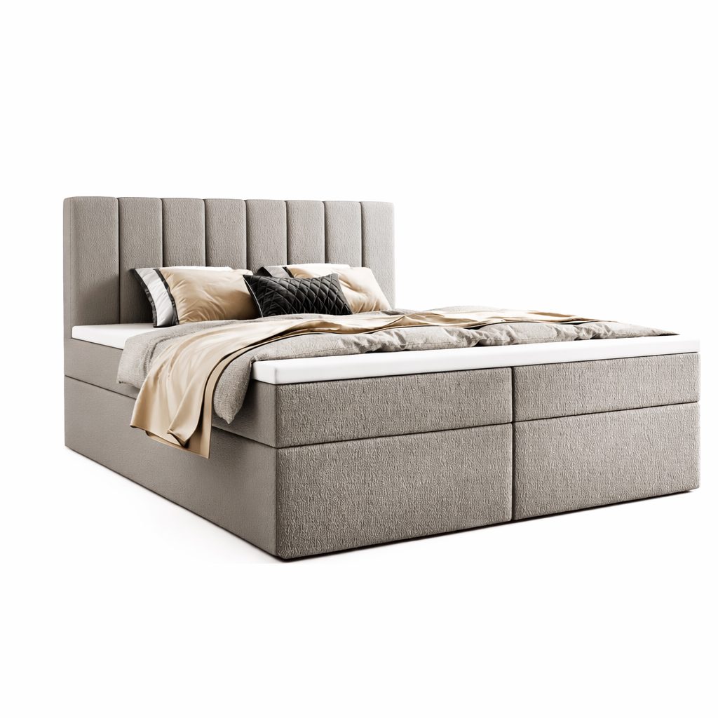 Pikowane wezgłowie o prostych, pionowych liniach dodaje łóżku lekkości i elegancji, a jego wysokość zapewnia wygodne oparcie. Solidna baza z dyskretnym podziałem skrywa praktyczny pojemnik, który ułatwia utrzymanie porządku.