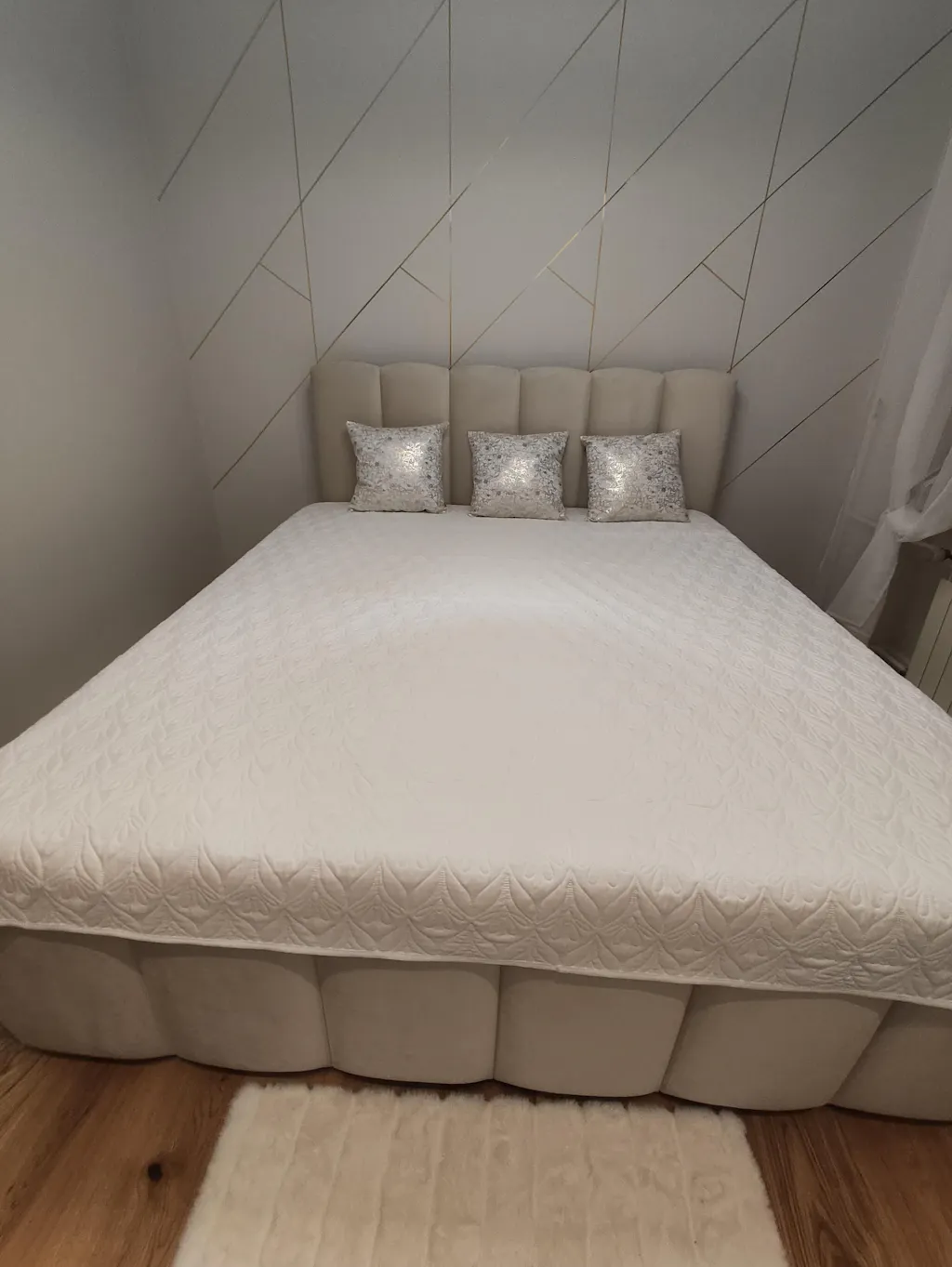 Pikowane, zaokrąglone wezgłowie – składa się z szerokich, pionowych segmentów, co nadaje mu miękki i harmonijny wygląd, podkreślając nowoczesną geometrię.