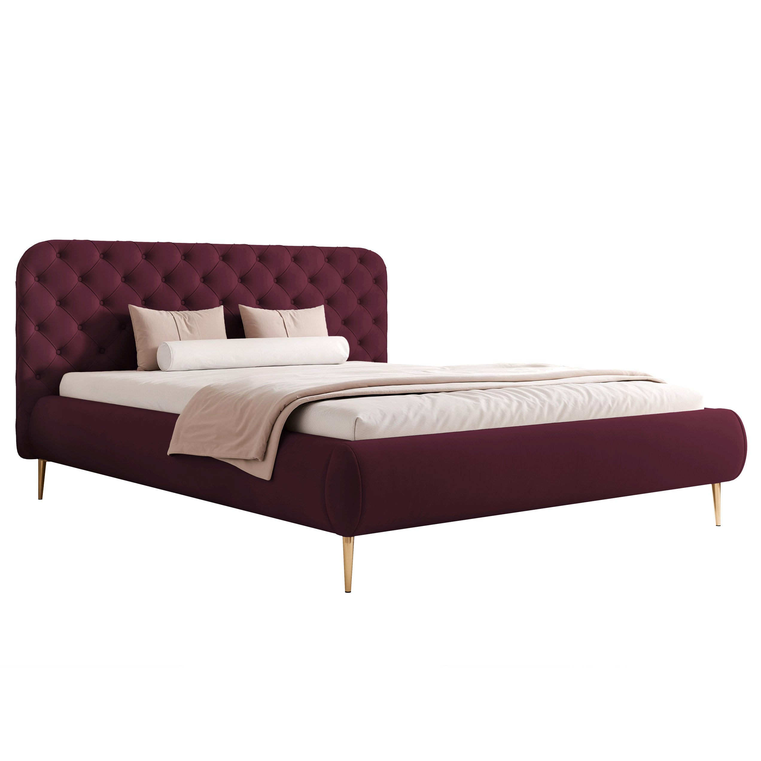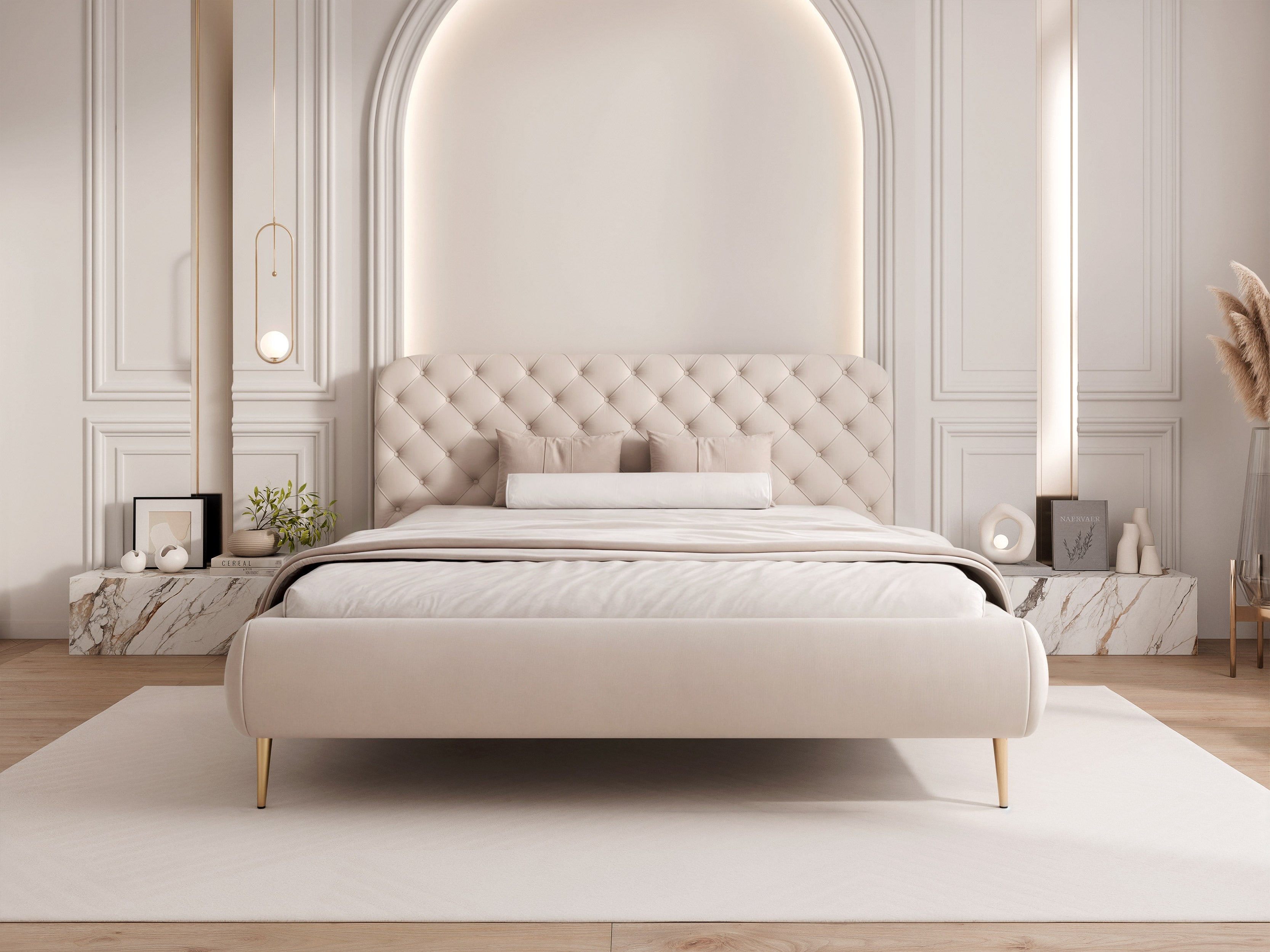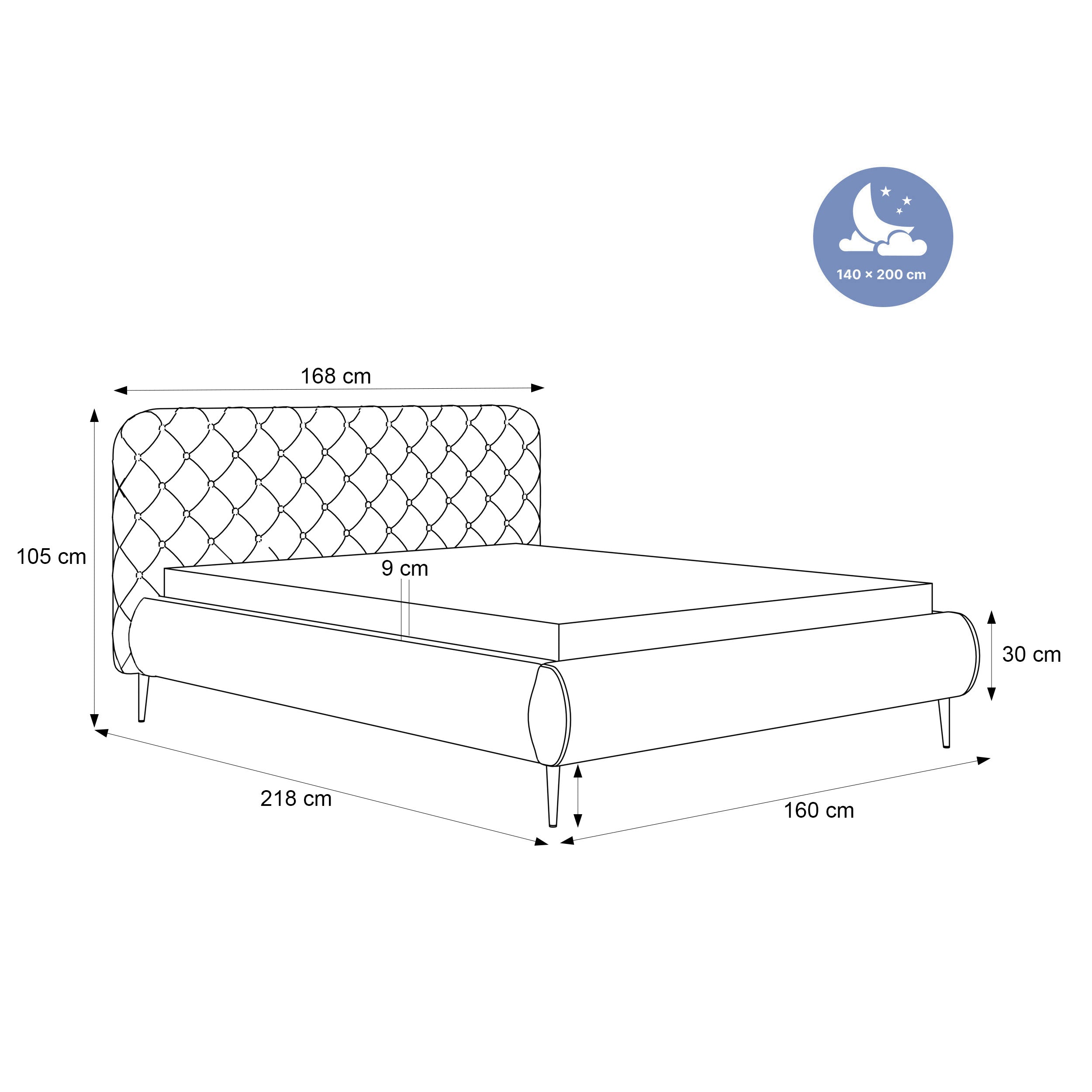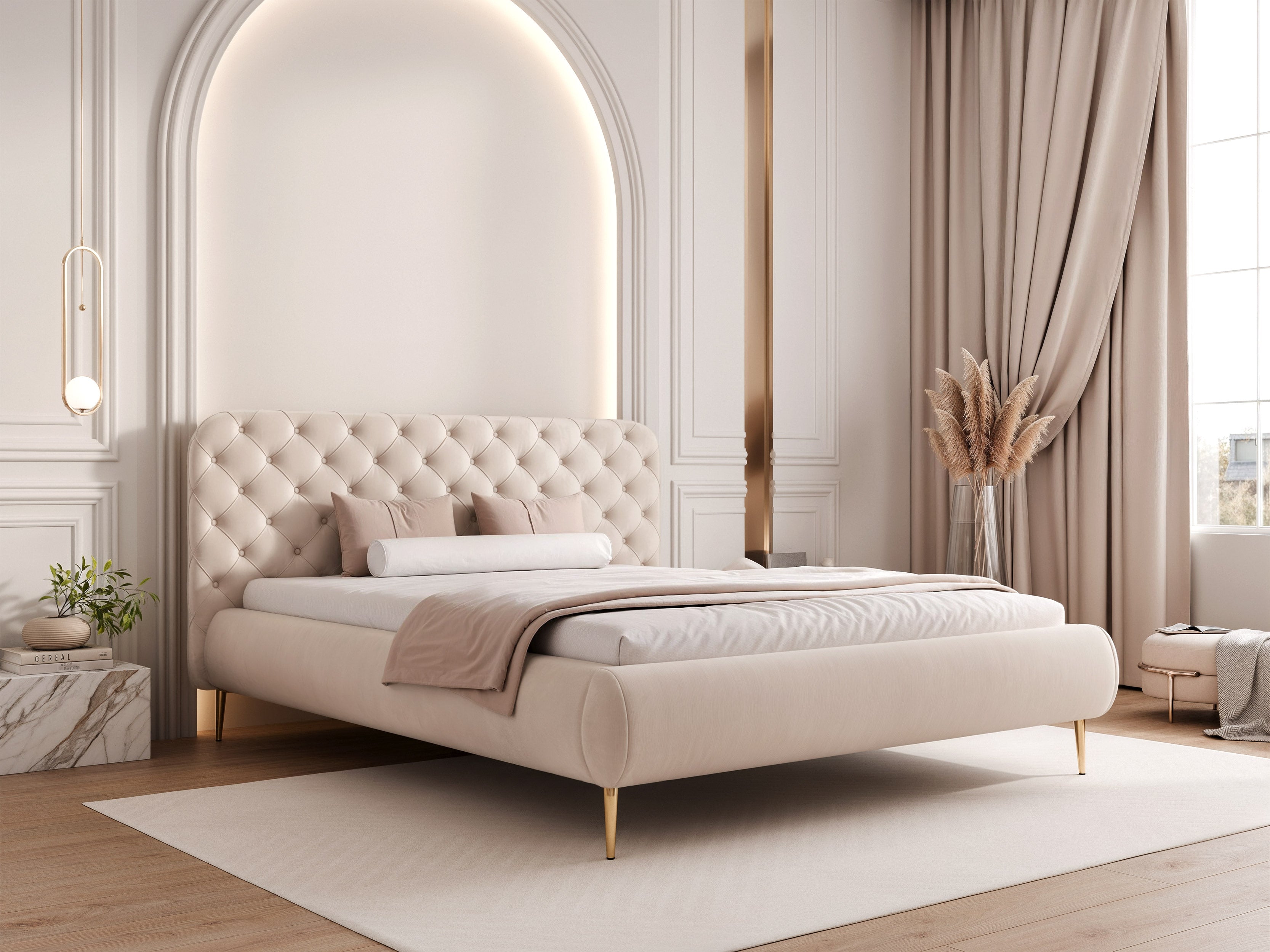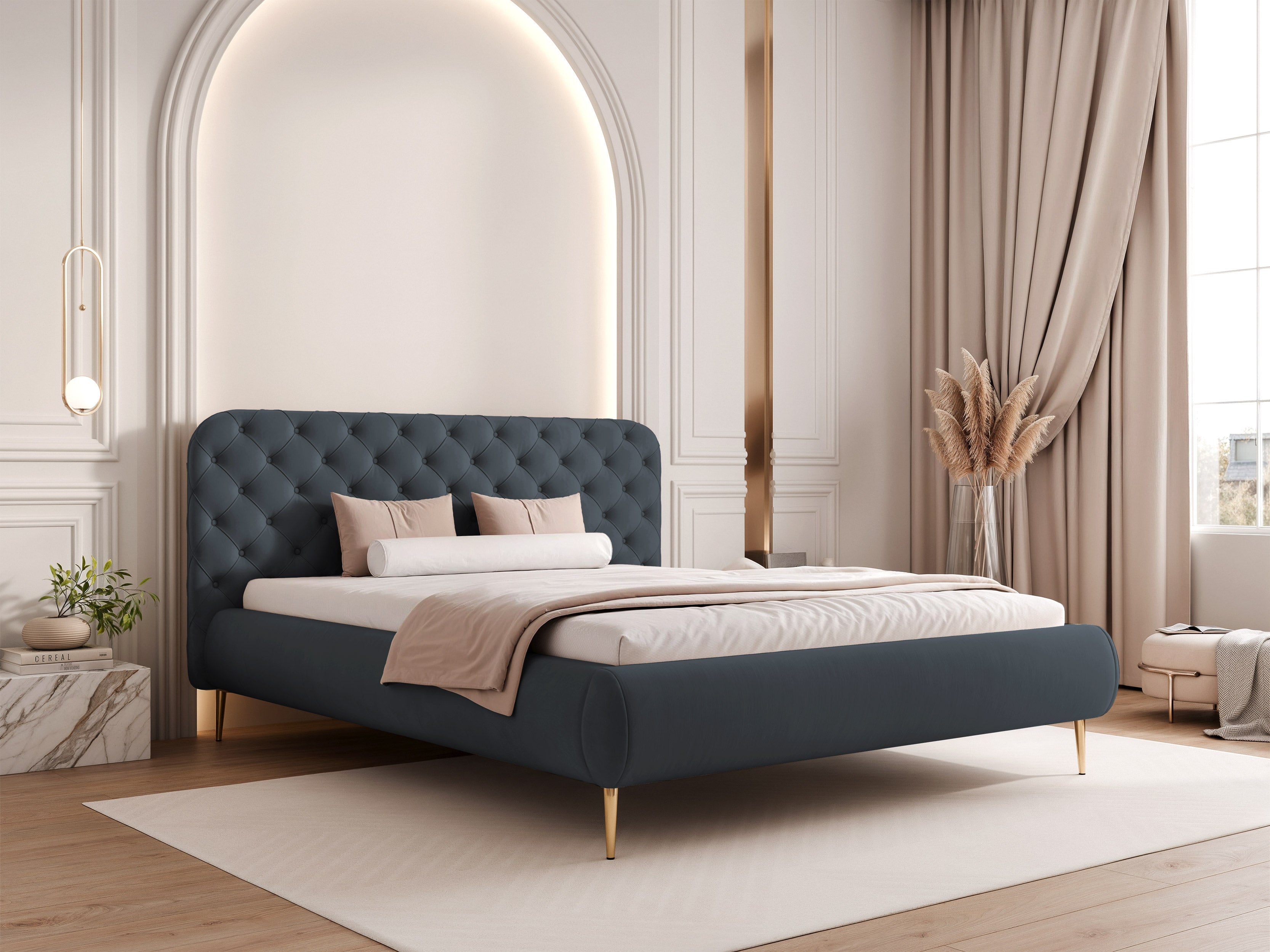 Céleste – wysokie nogi to wariant, który łączy elegancki, pikowany zagłówek z lekką wizualnie formą opartą na wysokich nogach. Taka konstrukcja nadaje bryle nowoczesny charakter, ułatwia sprzątanie i sprawia, że łóżko dobrze prezentuje się także w mniejszych sypialniach.