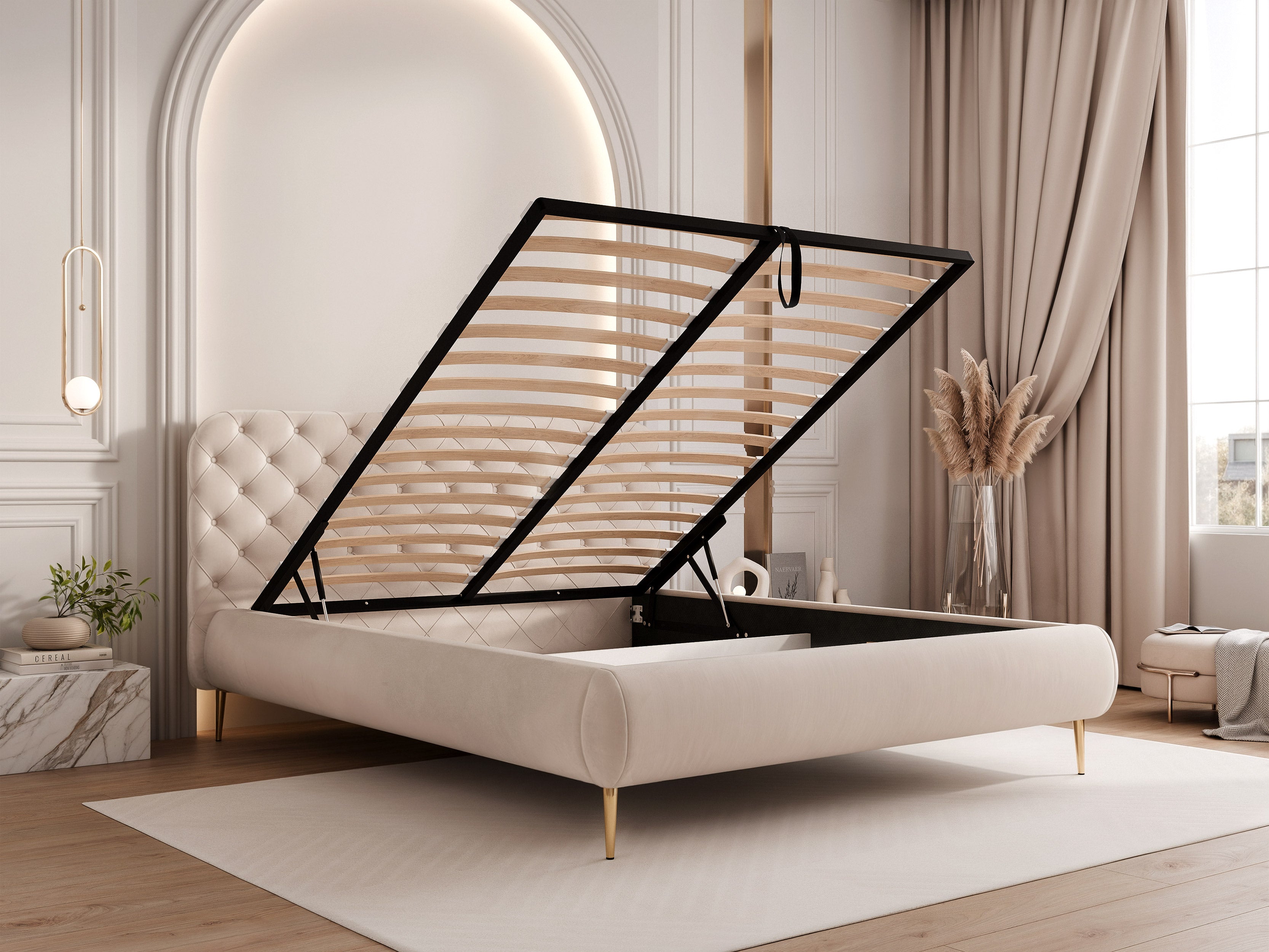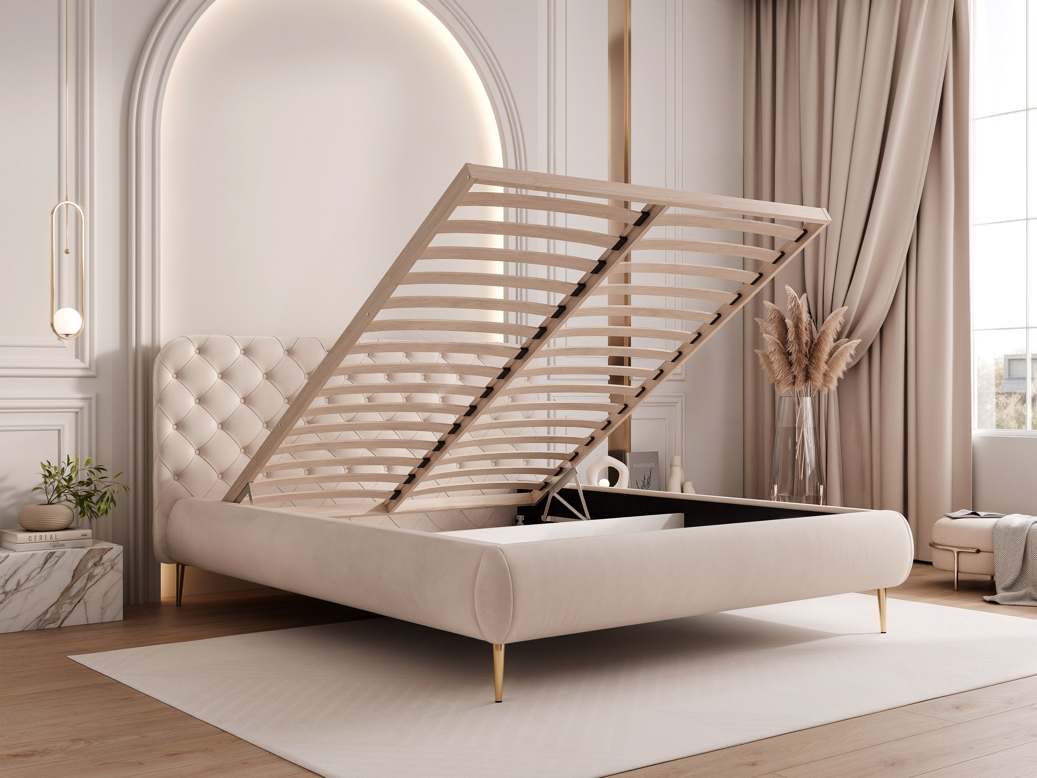 Delikatnie wyprofilowane nogi podkreśla wizualną lekkość łóżka, dodając mu subtelnej finezji. Idealnie sprawdzi się w przestrzeniach, gdzie liczy się zarówno design, jak i funkcjonalność – zapewniając łatwy dostęp do przestrzeni pod łóżkiem i ułatwiając utrzymanie porządku.