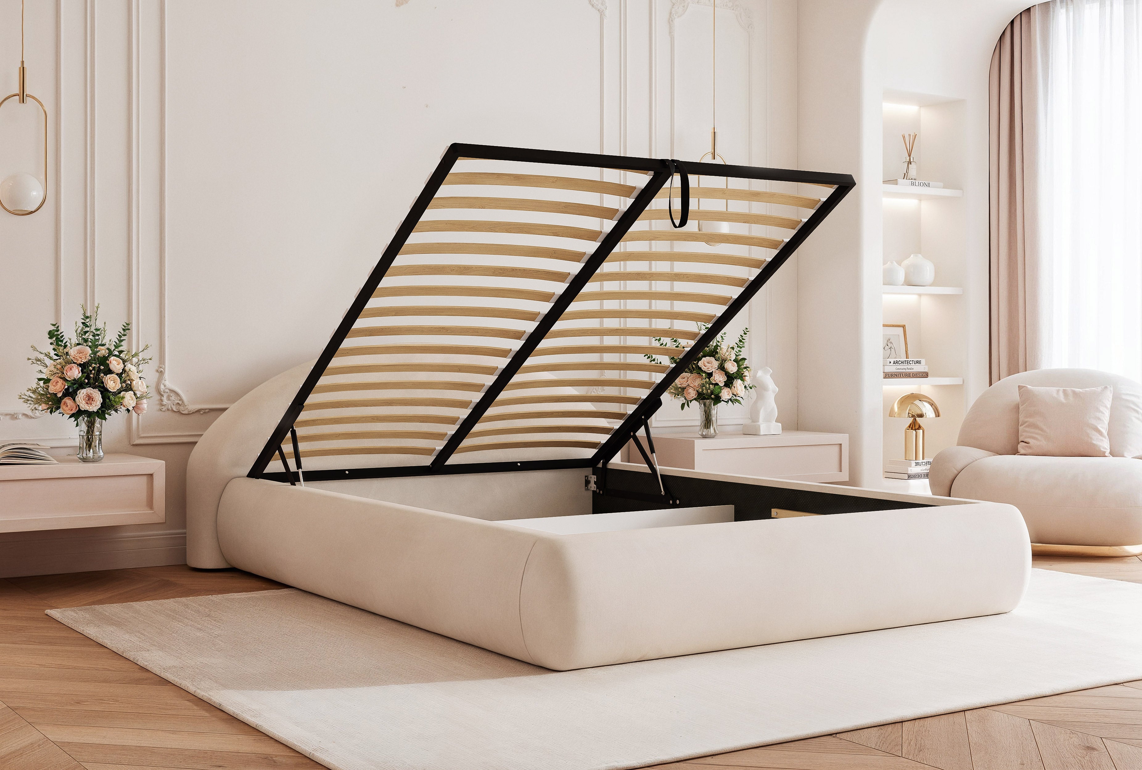 SKY posiada duży komfortowy pojemnik na pościel oraz stelaż drewniany z 32 listwami sprężynującymi.