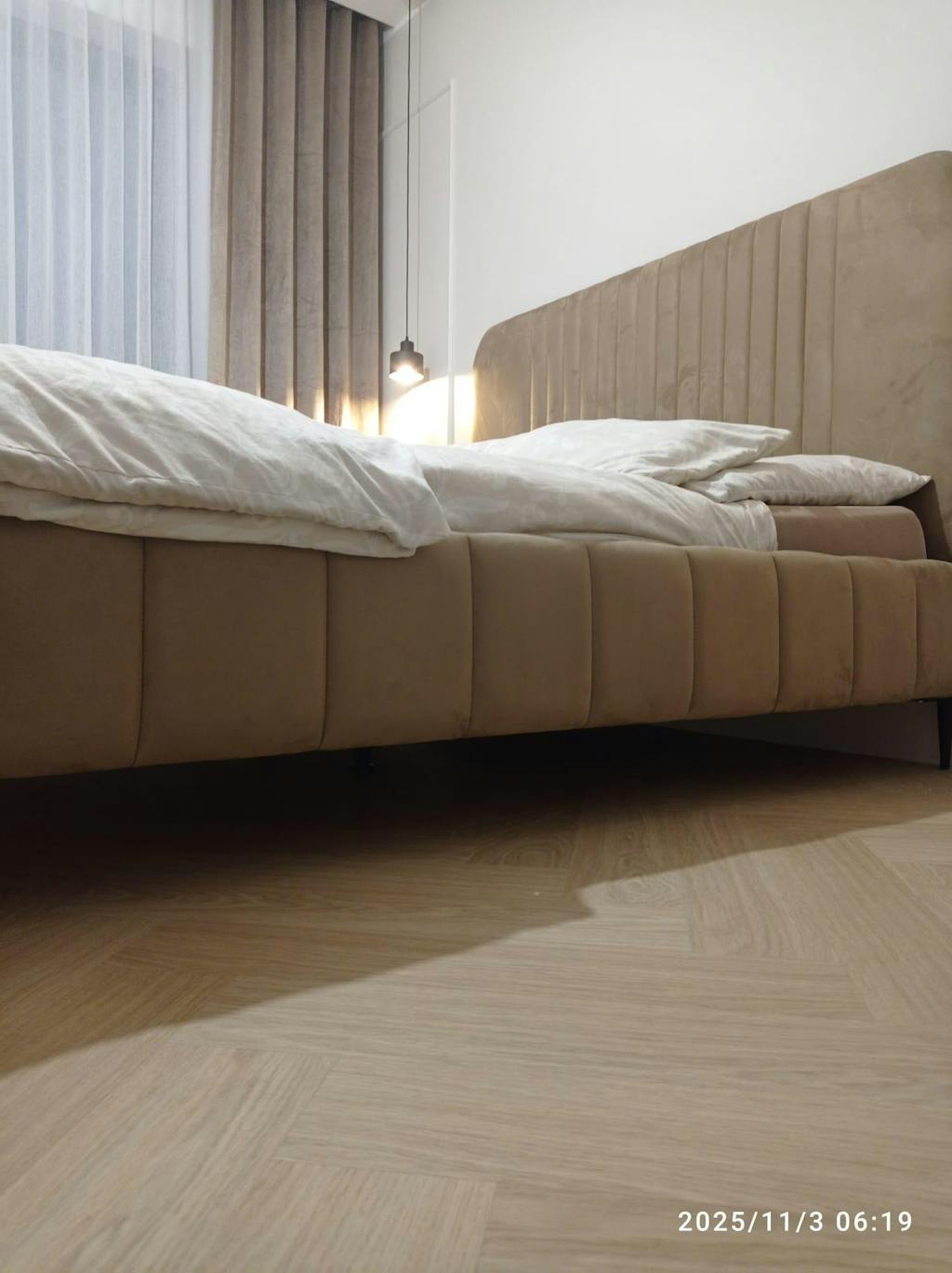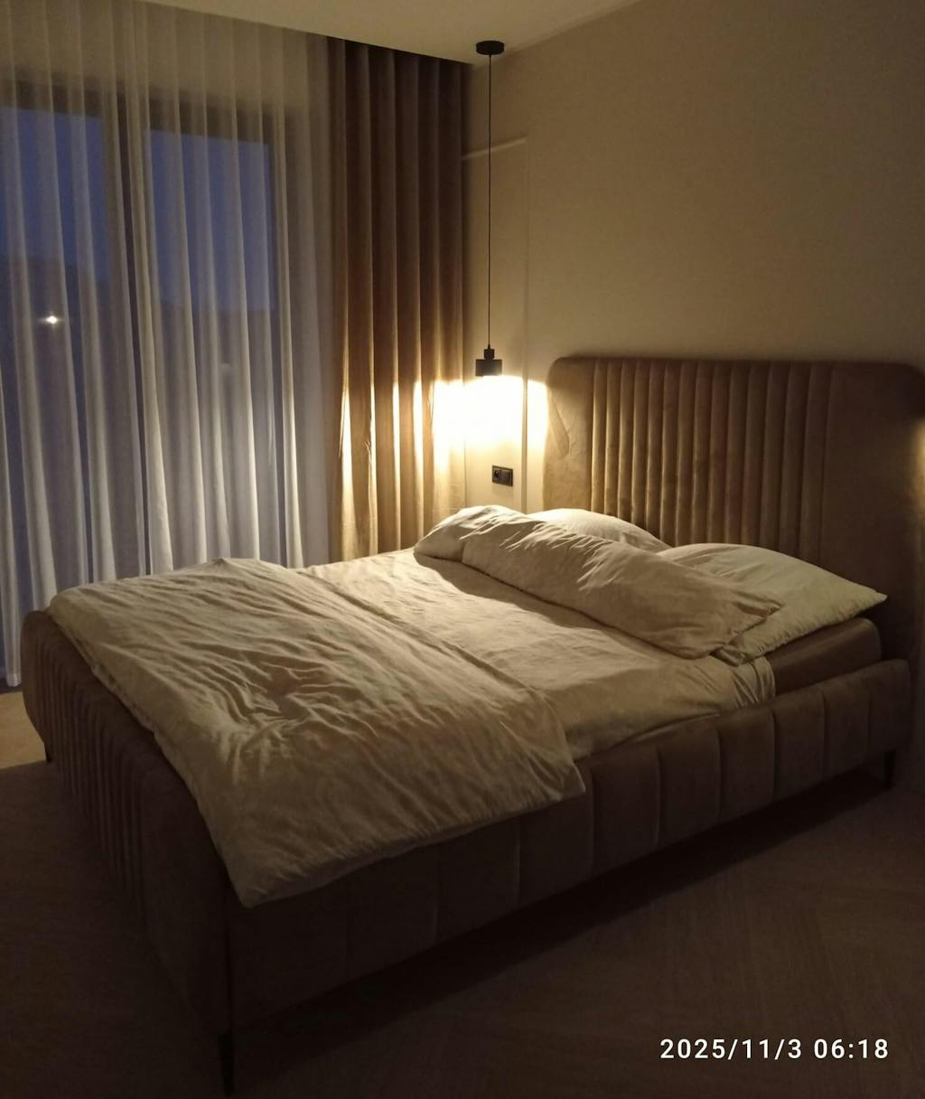Wysokie, wygodne wezgłowie z pionowymi pasami nadaje łóżku elegancką, nowoczesną formę. To stylowy akcent, który podkreśla luksusowy charakter sypialni i zapewnia komfort podczas codziennego odpoczynku.