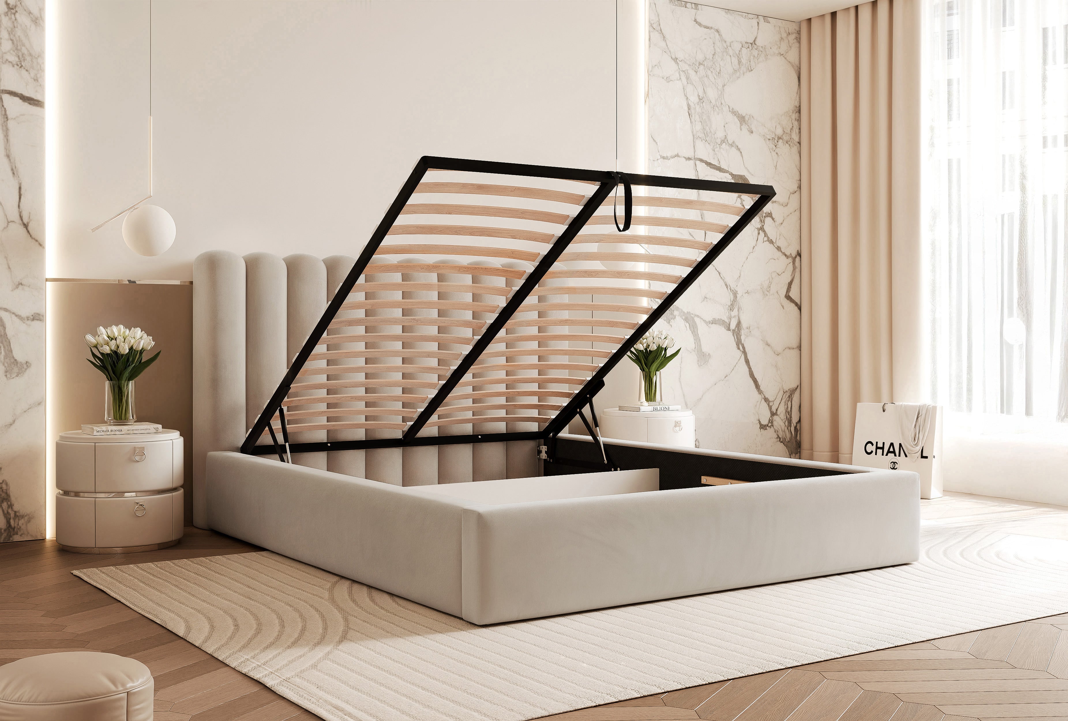 Oba stelaże metalowe wyposażono w podnośniki gazowe, które znacznie ułatwiają podnoszenie materaca i dostęp do pojemnika na pościel. Wystarczy delikatne pociągnięcie - podnośniki przejmują ciężar konstrukcji.