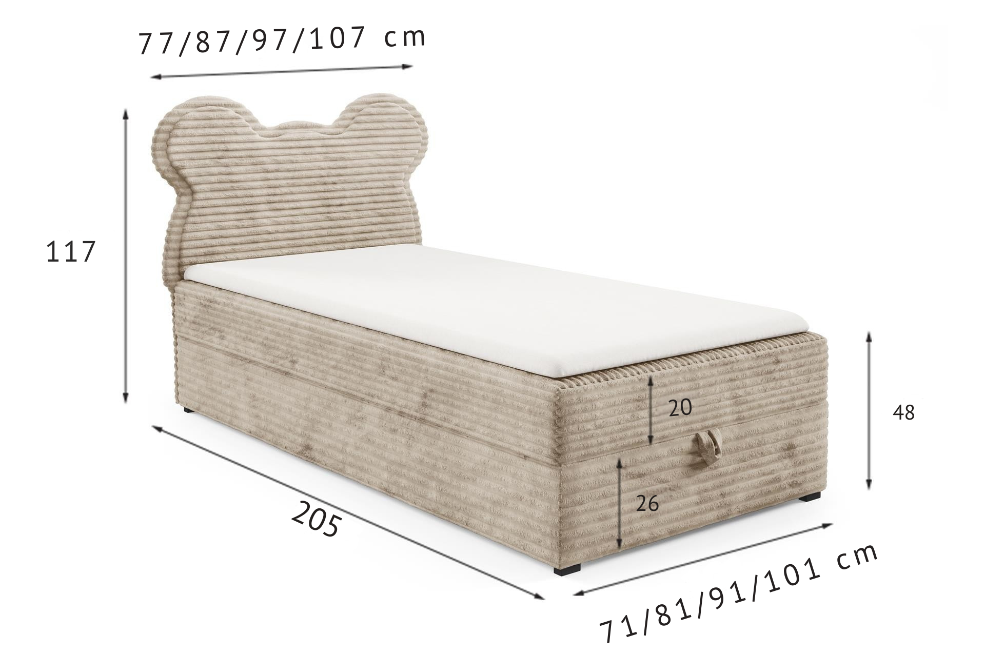 Pojemniki na pościel z automatem – lekkie naciśnięcie wystarczy, aby uzyskać dostęp do przechowywanych rzeczy. Tył łóżka obity tkaniną chroni ścianę przed zarysowaniami i zabrudzeniami. To detale, które docenisz w codziennym użytkowaniu.