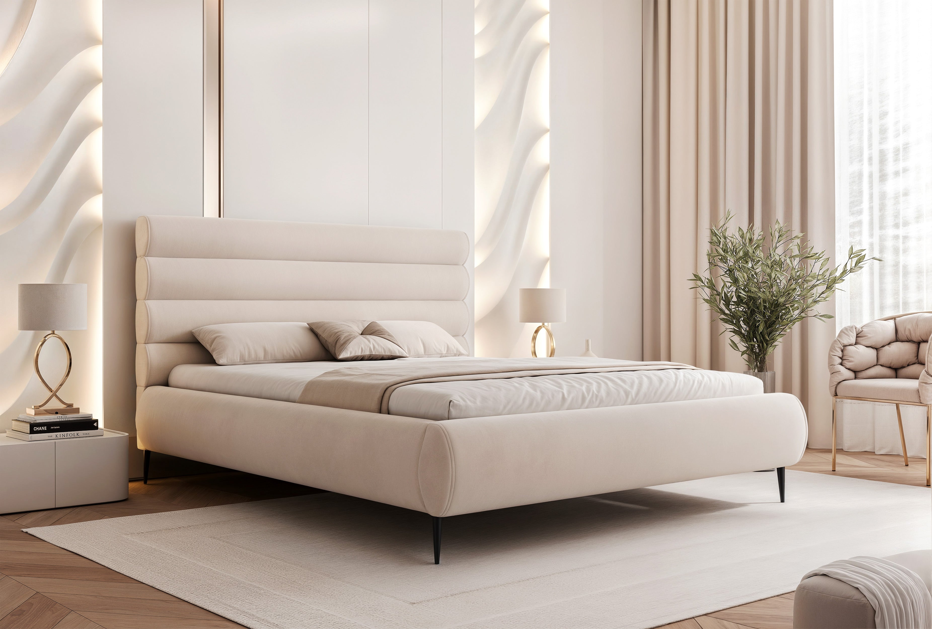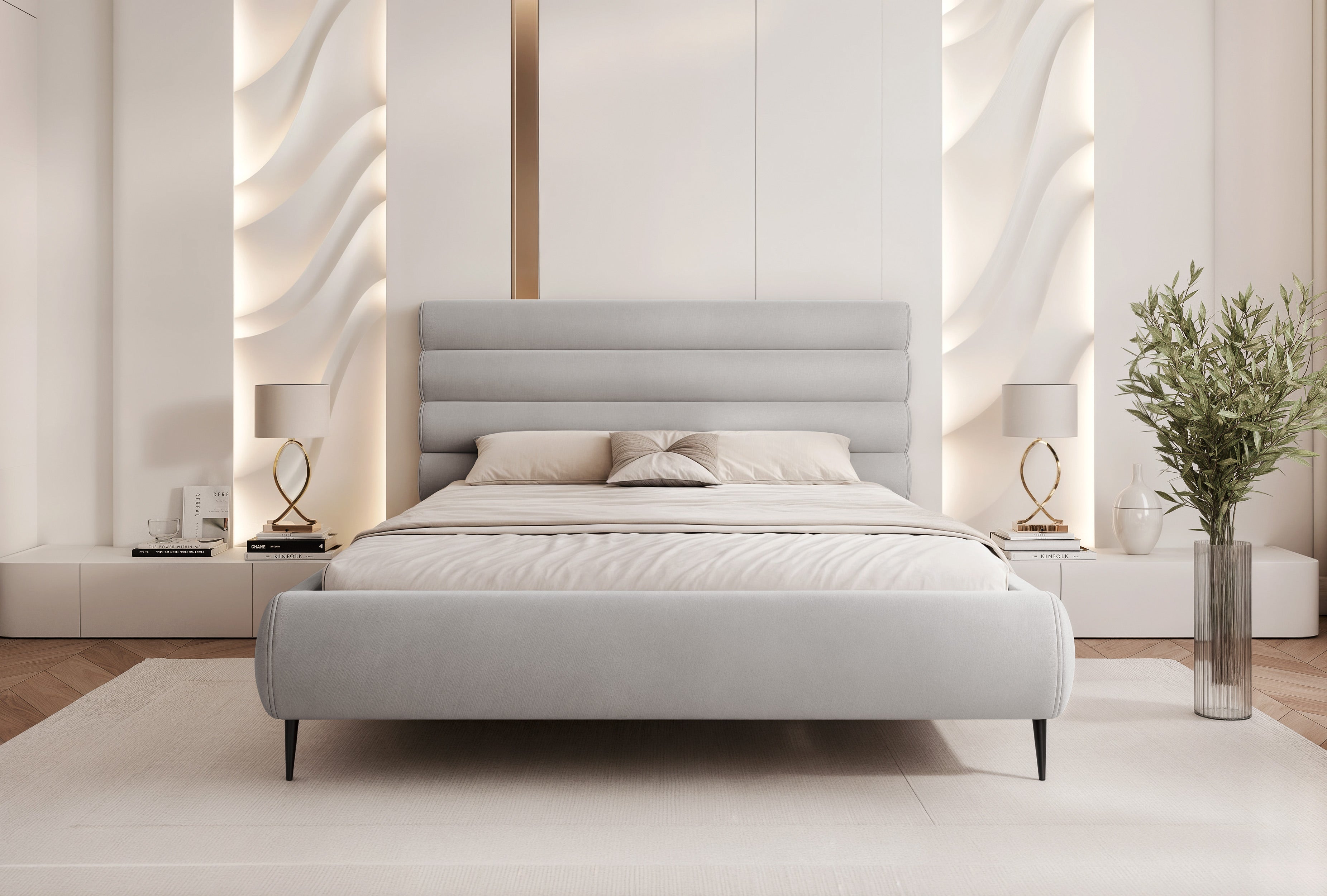 Bolstra to łóżko o charakterystycznym, miękkım zagłowiu z poziomymi przeszyciami, które nadają mu wyrazisty charakter. Zaokrąglone formy i tapicerowana obudowa tworzą przytulną, hotelową atmosferę w sypialni. Całość prezentuje się lekko i nowocześnie, mimo solidnej konstrukcji. To mebel, który staje się centralnym punktem wnętrza.