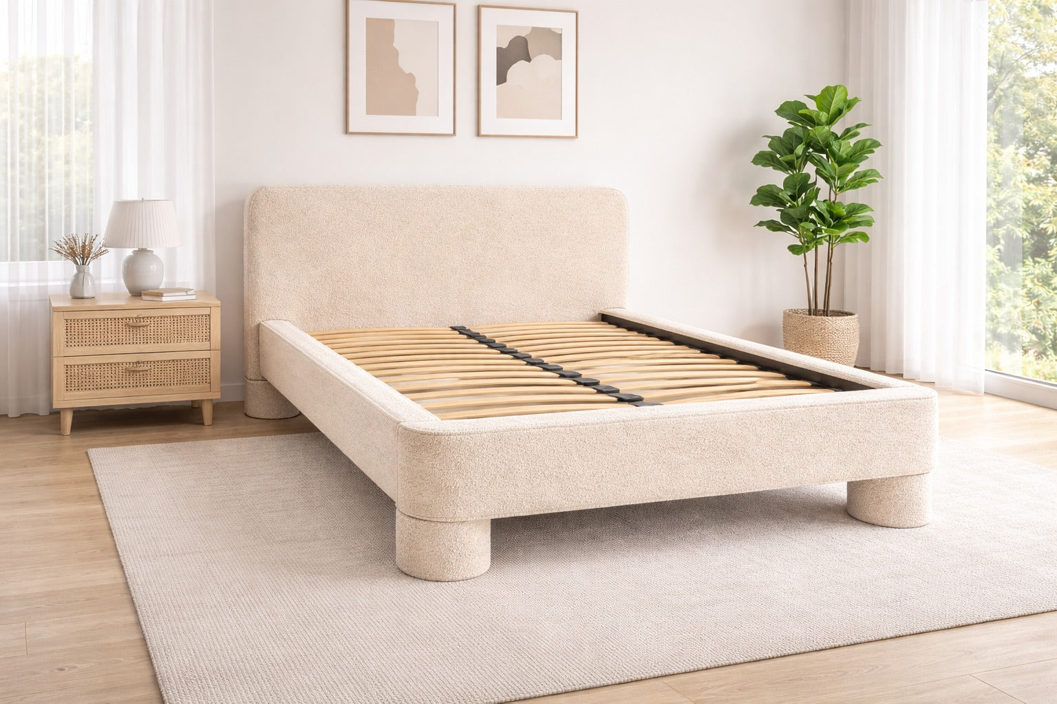 Nuvola to niskie, nowoczesne łóżko tapicerowane o miękkiej, zaokrąglonej linii. Prosta bryła, szerokie boki i masywne, cylindryczne nogi tworzą spójną formę, która dobrze wygląda zarówno w jasnych, minimalistycznych wnętrzach, jak i bardziej przytulnych aranżacjach. Model zaprojektowany z myślą o estetyce i codziennym komforcie użytkowania.