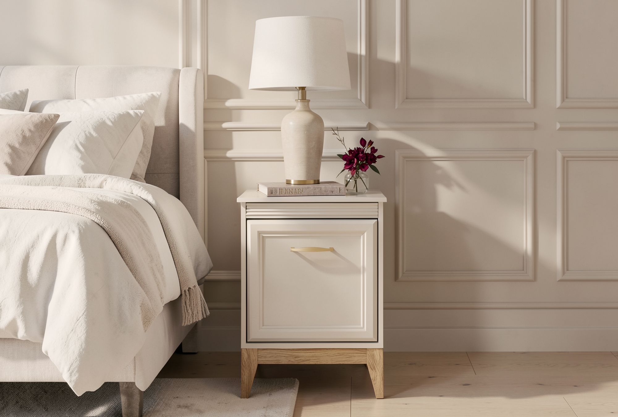 Szafka nocna Eloise doskonale uzupełni aranżację sypialni w stylu klasycznym, nowoczesnym lub skandynawskim. Może pełnić także funkcję stolika pomocniczego w salonie lub gabinecie.