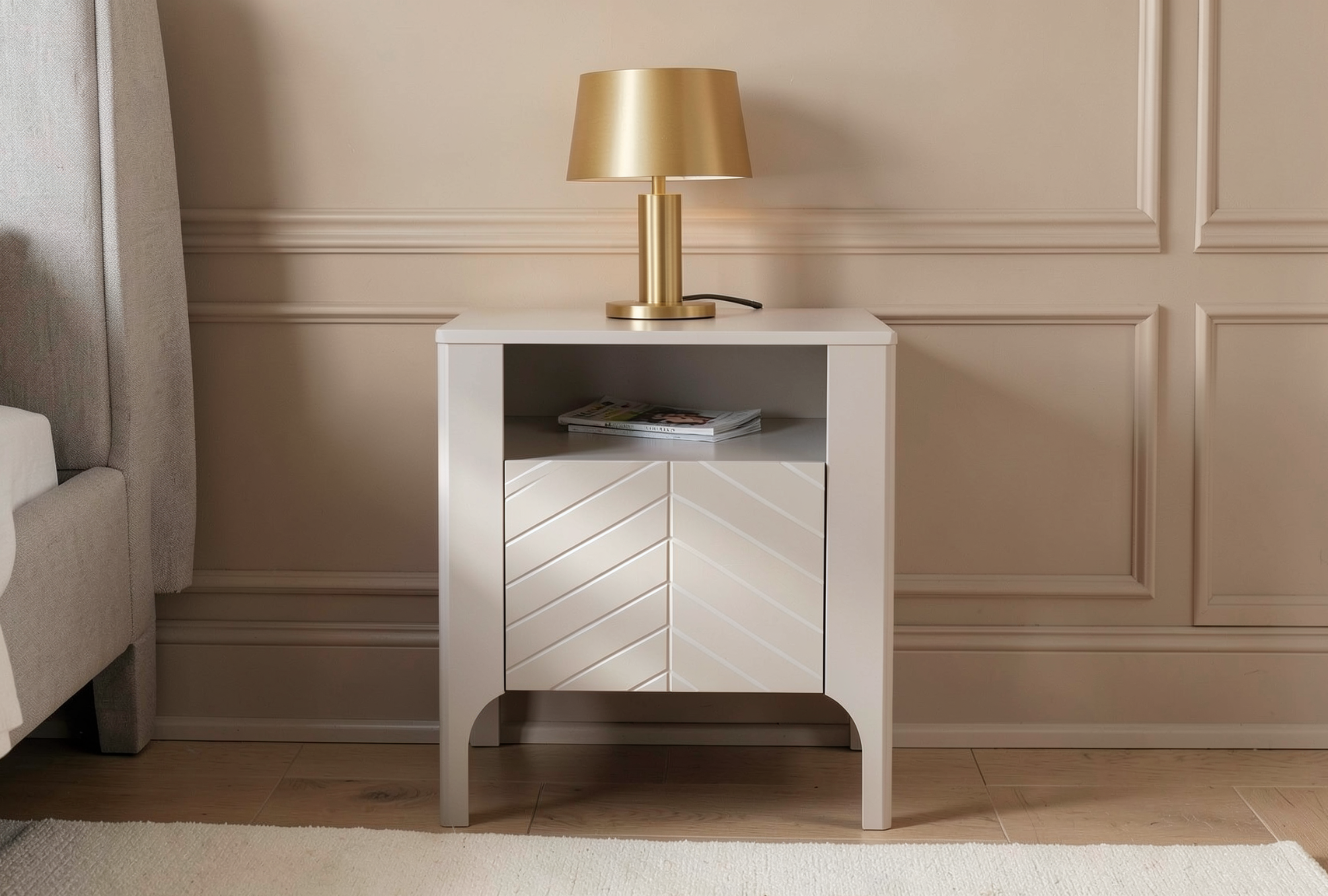 Szafka nocna Monteli to mały mebel o dużych możliwościach. Spójna stylistyka z całą kolekcją, elegancki detal jodełki i praktyczne wnętrze sprawiają, że jest to funkcjonalny i estetyczny element każdej sypialni – zarówno nowoczesnej, jak i w stylu japandi czy soft glam.