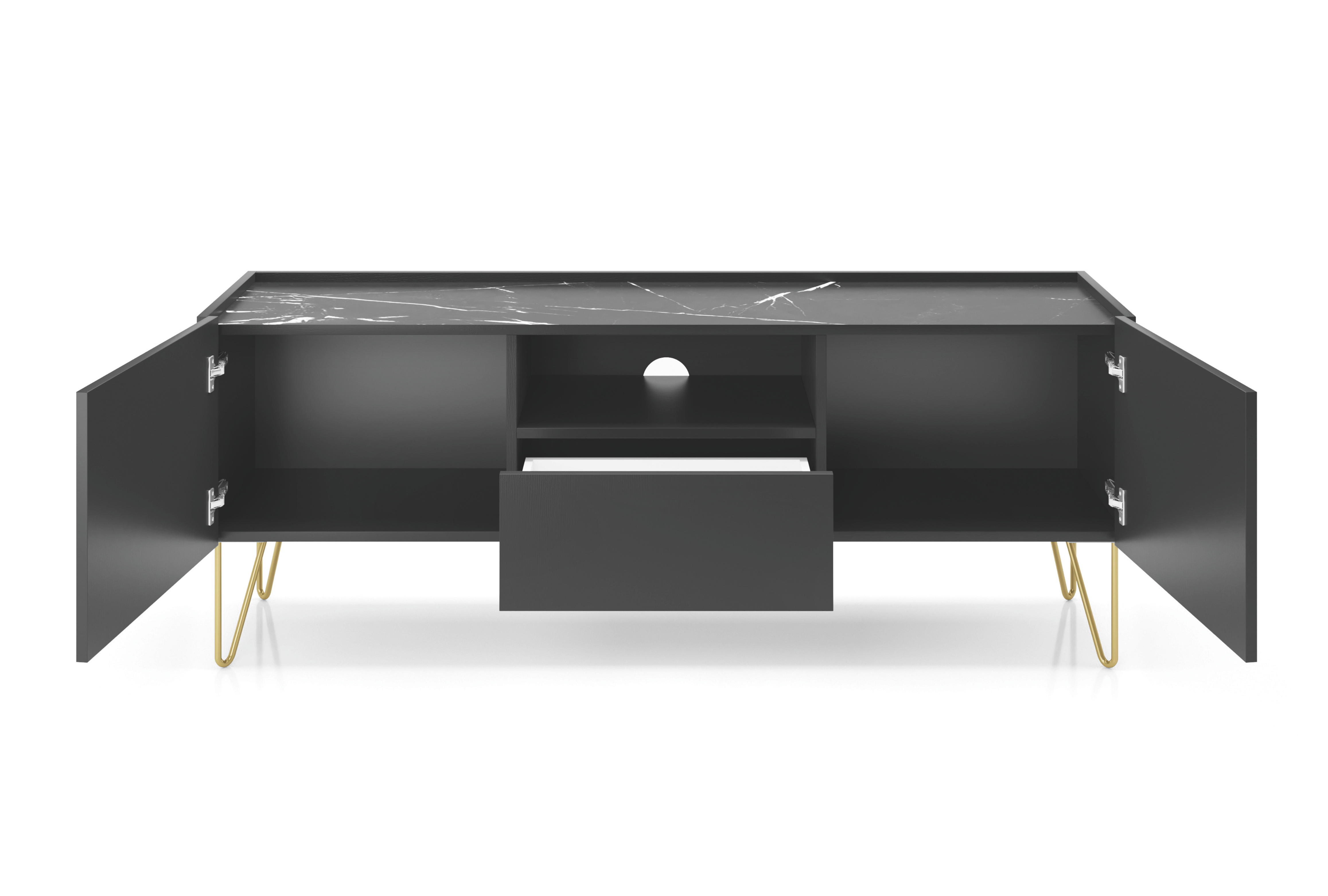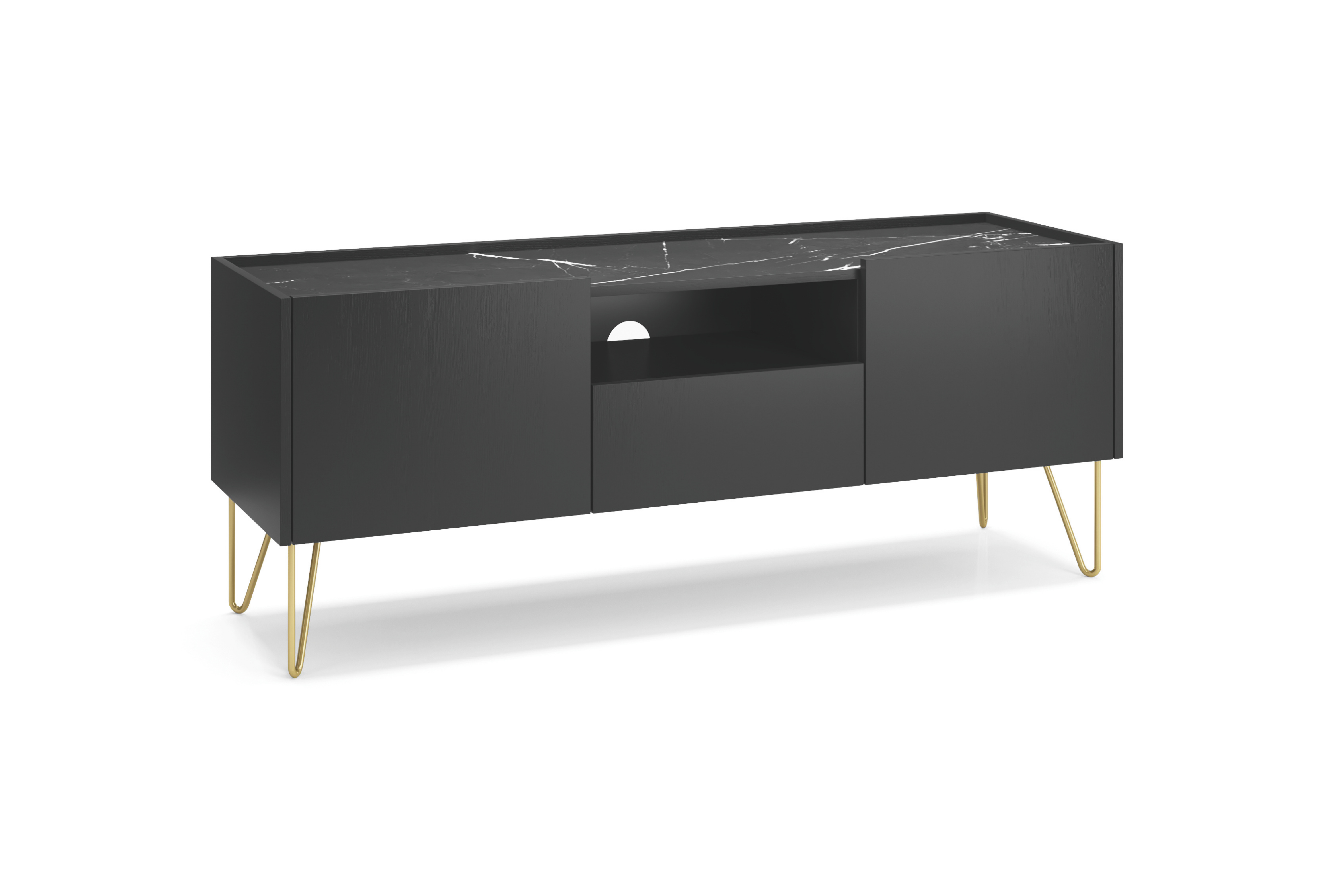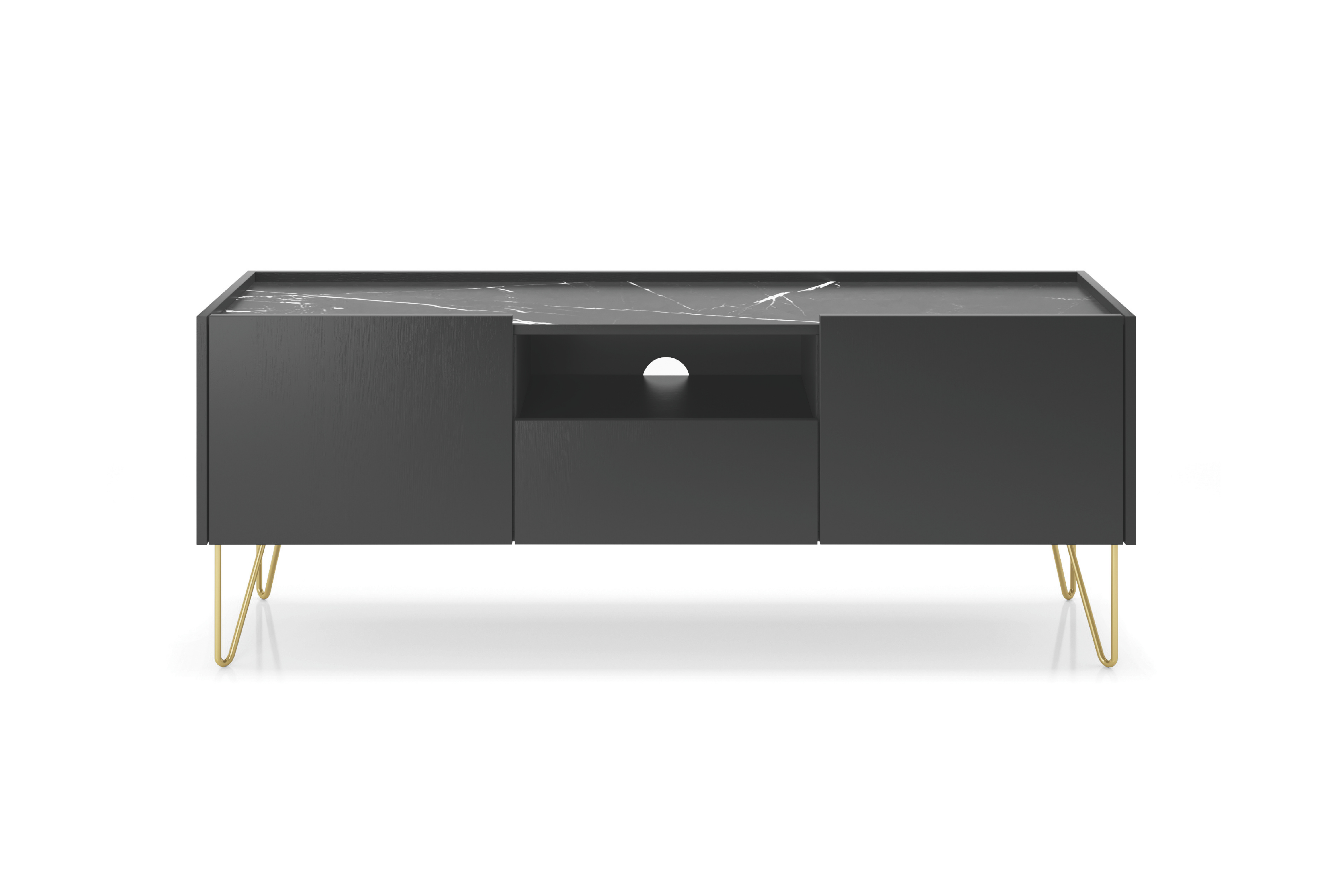 Czarna, matowa powierzchnia w połączeniu z blatem o wykończeniu imitującym czarny marmur tworzy efekt subtelnego luksusu, który podkreśla charakter całego wnętrza. Smukłe złote nóżki dodają lekkości i nadają formie szlachetnego wyrazu, jednocześnie gwarantując stabilność konstrukcji.