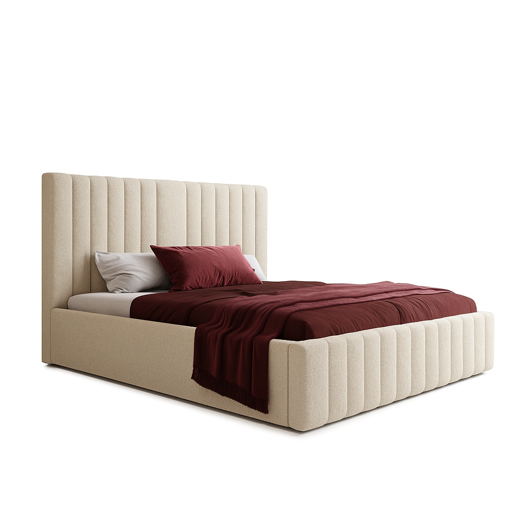 Pod minimalistyczną formą kryje się praktyczne wnętrze – duży pojemnik na pościel oraz stelaż z 32 elastycznych listew z drewna brzozowego gwarantują komfort i trwałość. Olivia to doskonały wybór dla tych, którzy szukają łóżka funkcjonalnego, a jednocześnie elegancko prostego w formie.